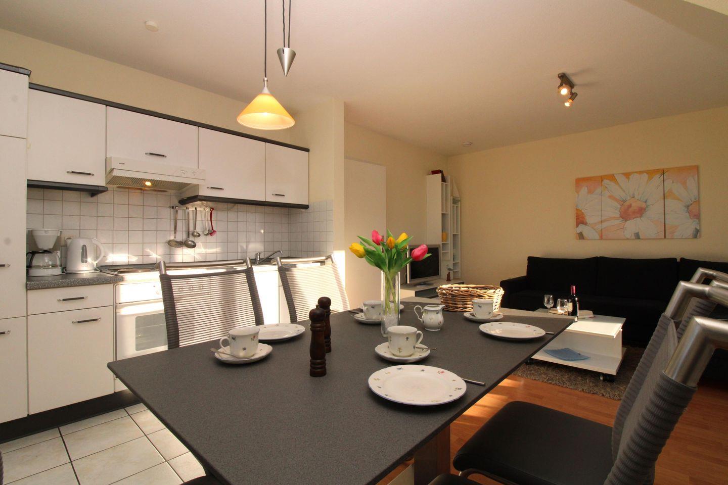 Der offene Küchenbereich beinhaltet eine voll ausgestattete Einbauküchenzeile mit 4-Platten-Herd, Backofen, Mikrowelle, Dunstabzug, Kühlschrank, Toaster, Kaffeemaschine und Wasserkocher. Die Küche ist mit Geschirr, Gläsern, Besteck und Töpfen komplett ausgestattet.