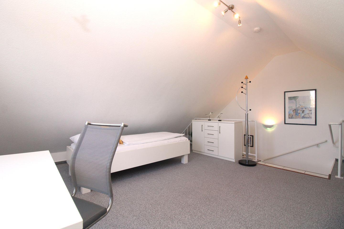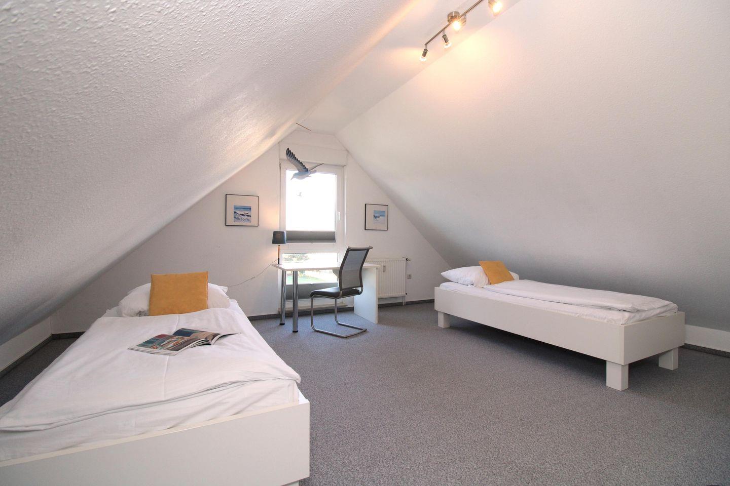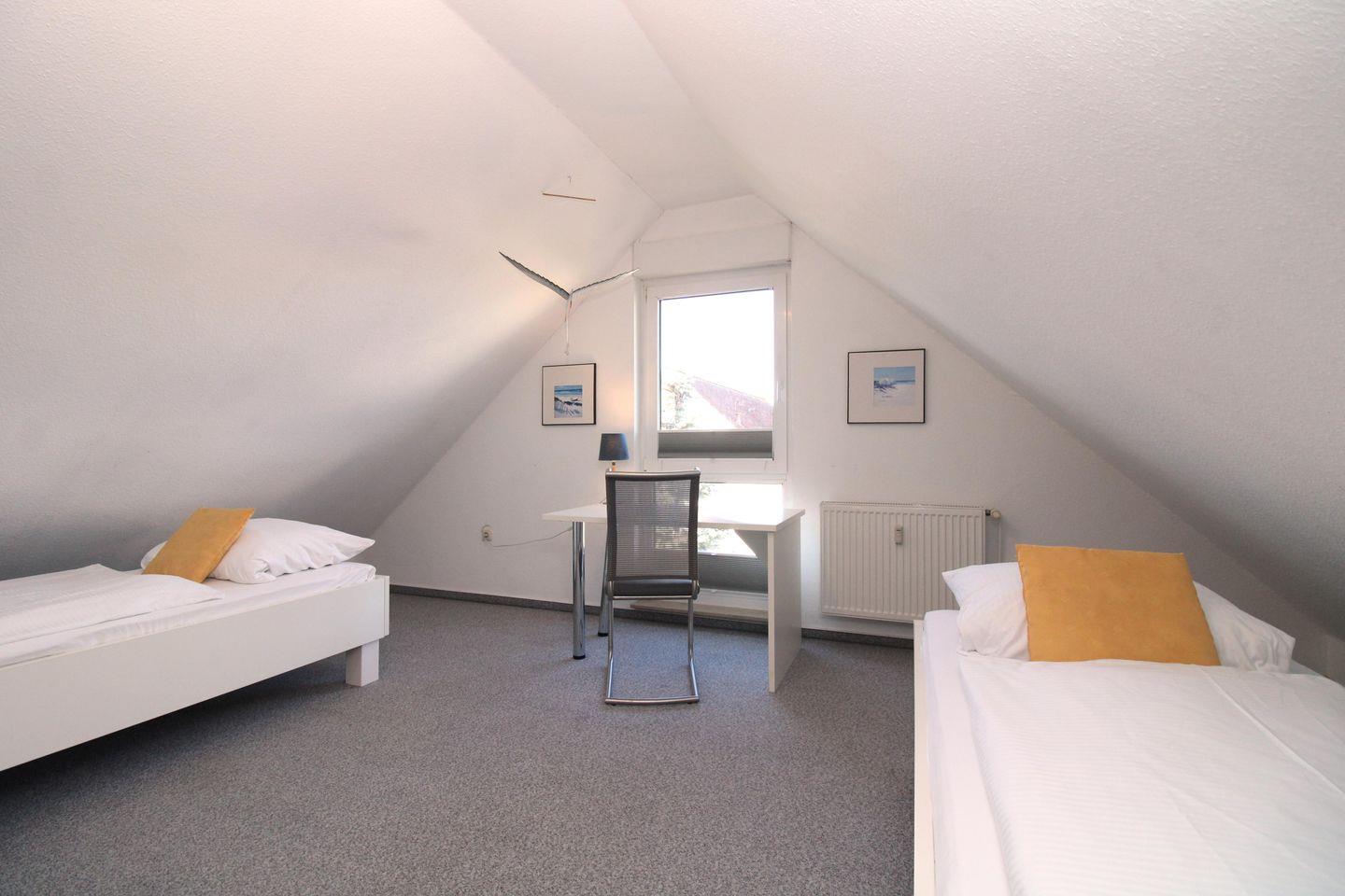 Das separate und offen gestaltete 2. Schlaf-/Kinderzimmer (im DG) verfügt über 2 getrennte Einzelbetten (2x90x200), eine Kommode sowie einen kleinen Schreibtisch mit Stuhl. Auch in diesem Zimmer befindet sich am Fenster eine Verdunkelungsjalousie.