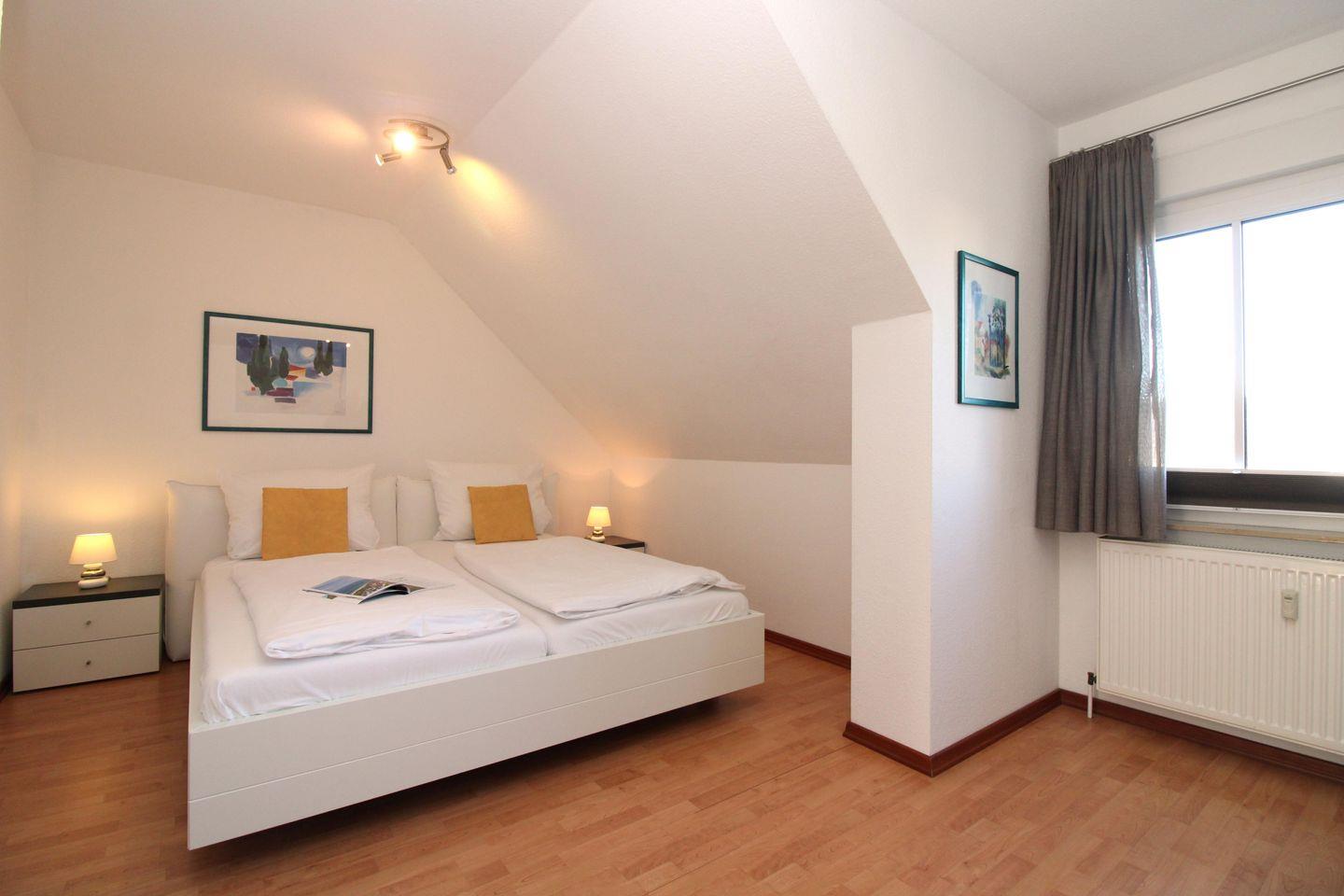 Das freundliche und geräumige 1. Schlafzimmer (im 1. OG) ist mit einem bequemen Doppelbett (2x90x200), Nachttischen, einem geräumigen Kleiderschrank sowie einem Sessel eingerichtet. Verdunkelungsjalousien am Fenster ermöglichen Ihnen einen erholsamen Schlaf.