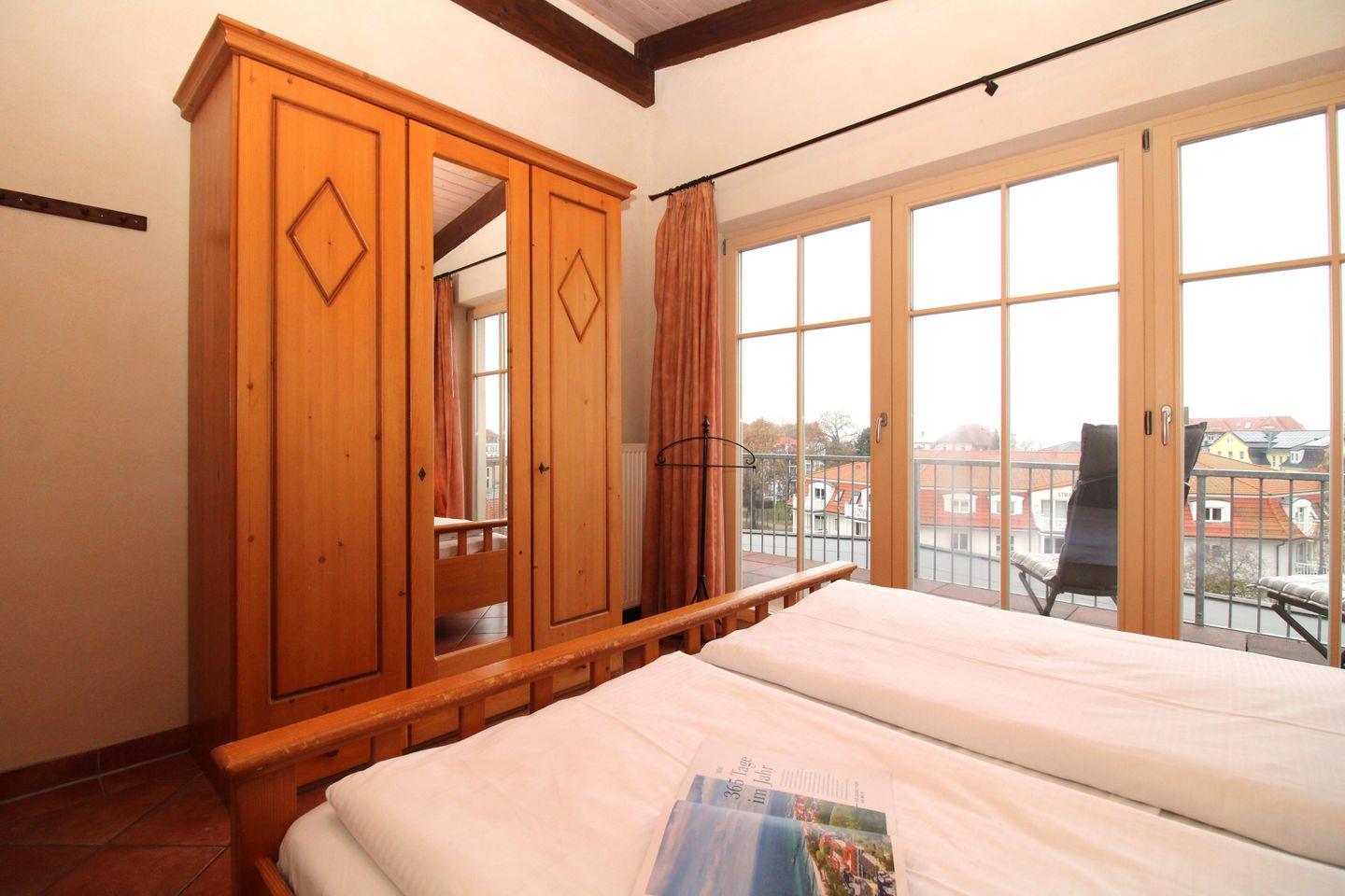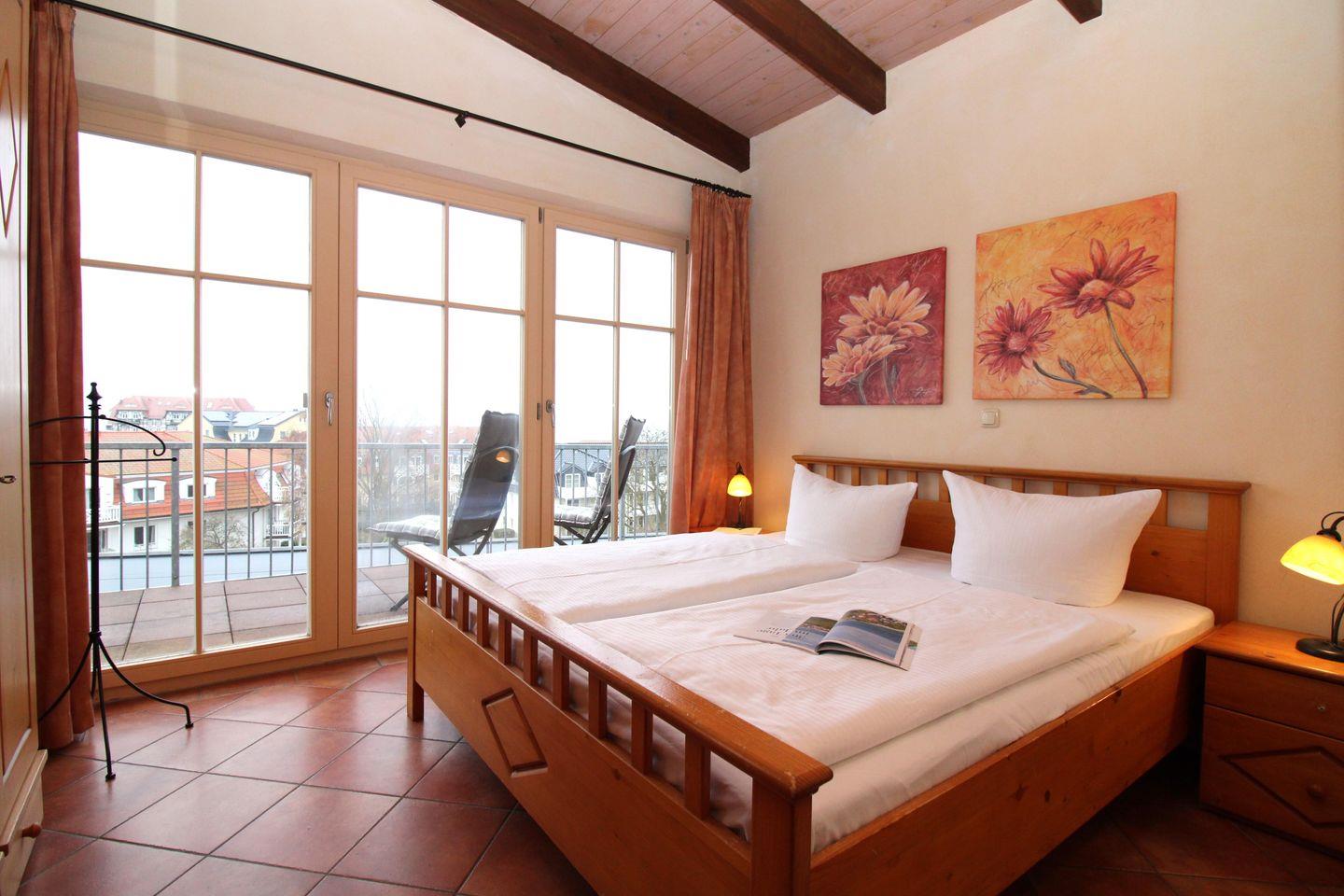 Das helle und freundliche 1. Schlafzimmer (im DG) ist mit einem bequemen Doppelbett (2x90x200), Nachttischen sowie einem geräumigen Kleiderschrank eingerichtet und bietet durch die bodentiefen Panoramafenster einen traumhaften Meer- und Weitblick. Von hier haben Sie ebenfalls direkten Zugang zu der großen Dachterrasse.