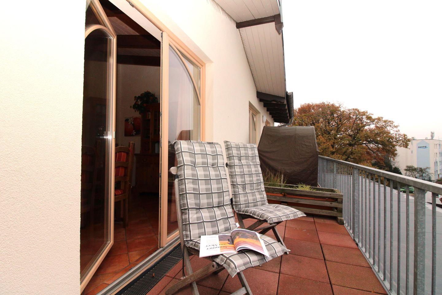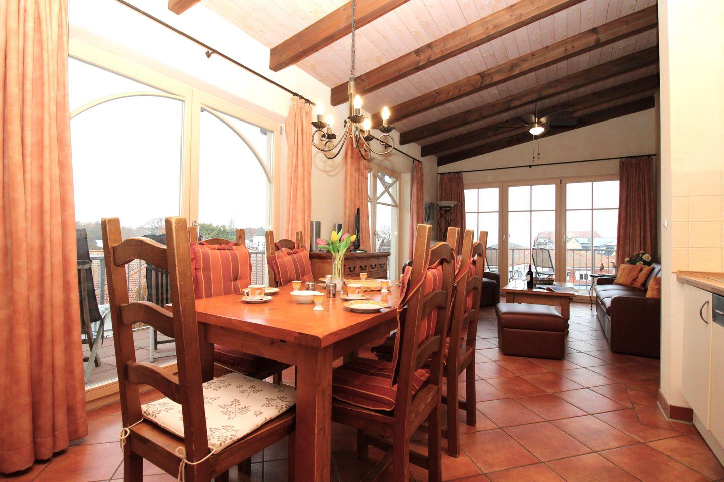 Das sehr geräumige und helle Wohn-/Esszimmer (im DG) verfügt über eine separate Sitzgruppe mit bequemer (Schlaf-)Couch, 2 Sessel, Hocker und Couchtisch, einen separaten Esstisch mit 6 Stühlen, einen Geschirrschrank sowie ein Sideboard. Durch die bodentiefen Fenster bzw. Terrassentüren dieses Raumes haben Sie überall direkten Zugang zu der herrlichen, ca. 33 m² großen und sonnigen Dachterrasse (nach Süden, Westen und Norden ausgerichtet) mit Balkonmöbeln. Hier sitzen Sie entspannt und gemütlich hoch über den Dächern und können abends bei einem guten Glas Wein in Ruhe die lauen Sommernächte genießen!