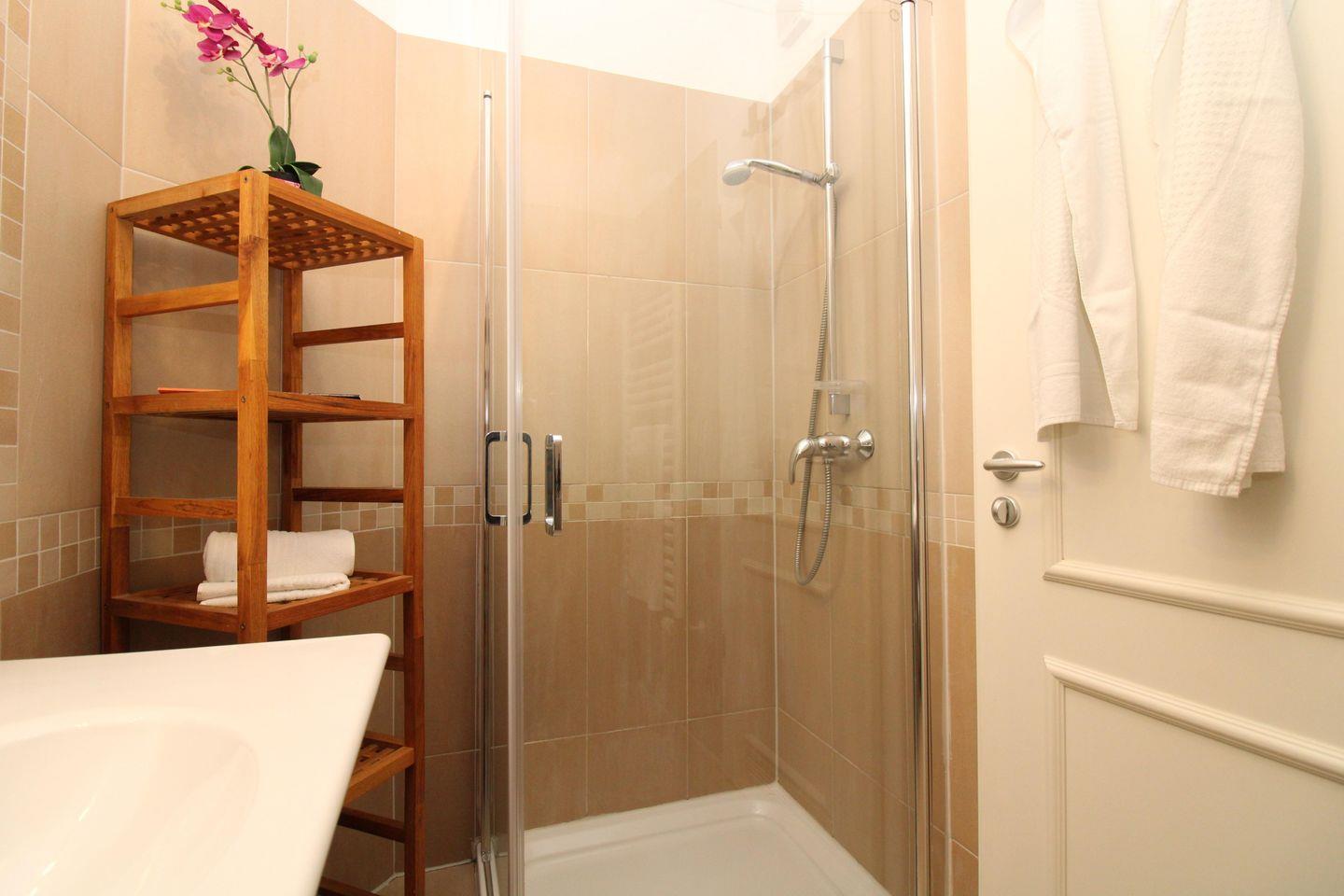 Das Badezimmer verfügt über eine Dusche mit Echtglas-Abtrennung und flachem Einstieg (seniorenfreundlich!), Waschbecken, Kosmetikspiegel, Föhn, Handtuch-Heizkörper, WC sowie ein Regal und ausreichend Ablagemöglichkeiten.