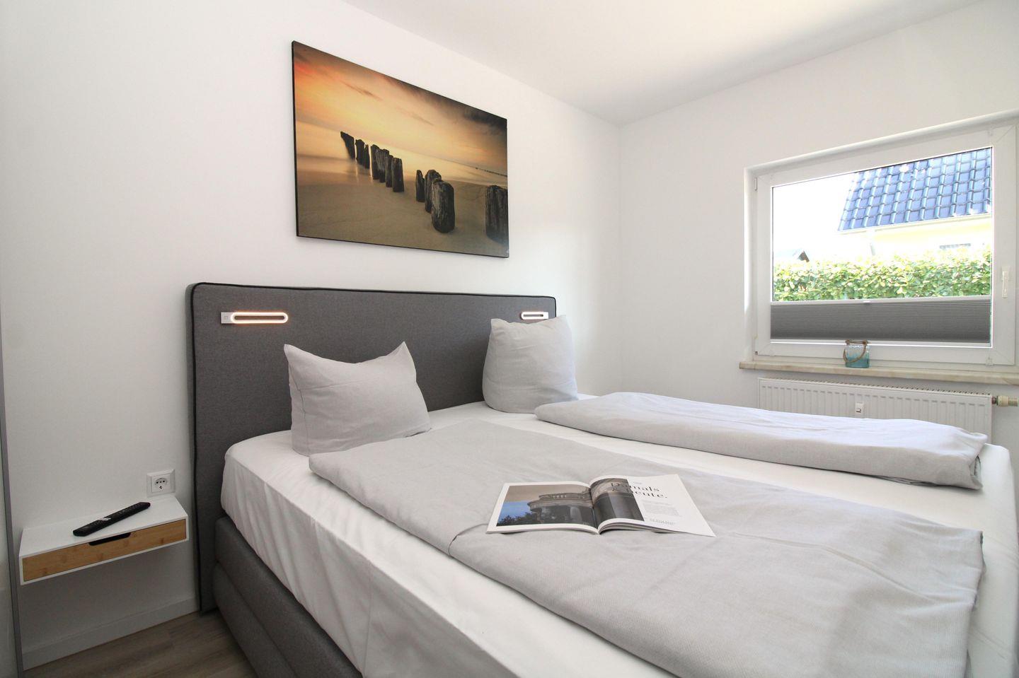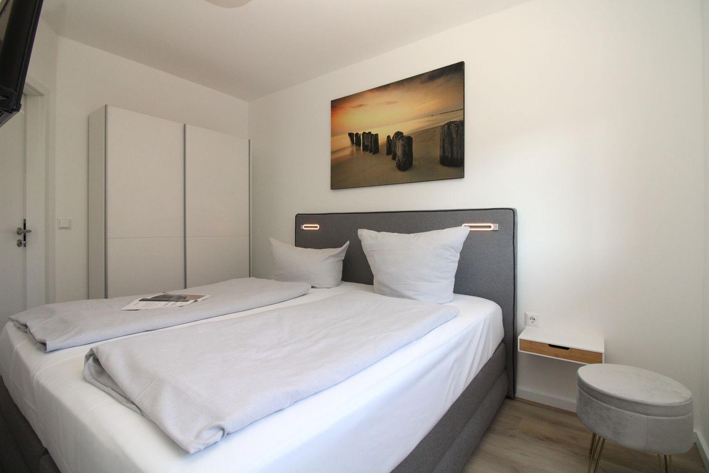 Das freundliche Schlafzimmer ist mit einem bequemen Boxspring-Doppelbett (180 cm x 200 cm), Nachttischen mit Nachttischlampen sowie einem geräumigen Kleiderschrank eingerichtet. Weiterhin steht Ihnen hier ein zusätzliches TV-Gerät zur Verfügung.