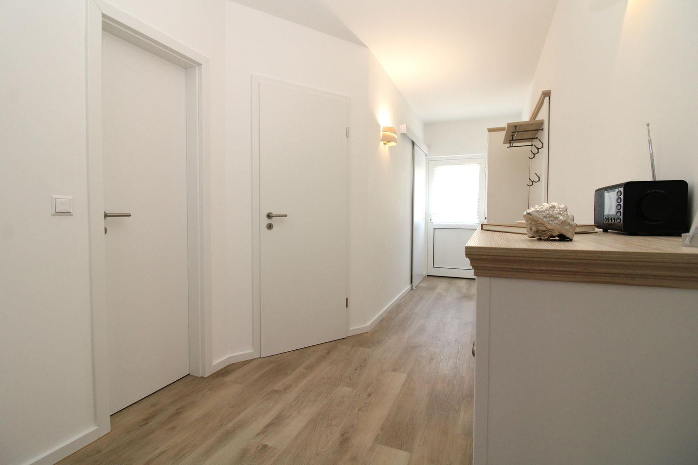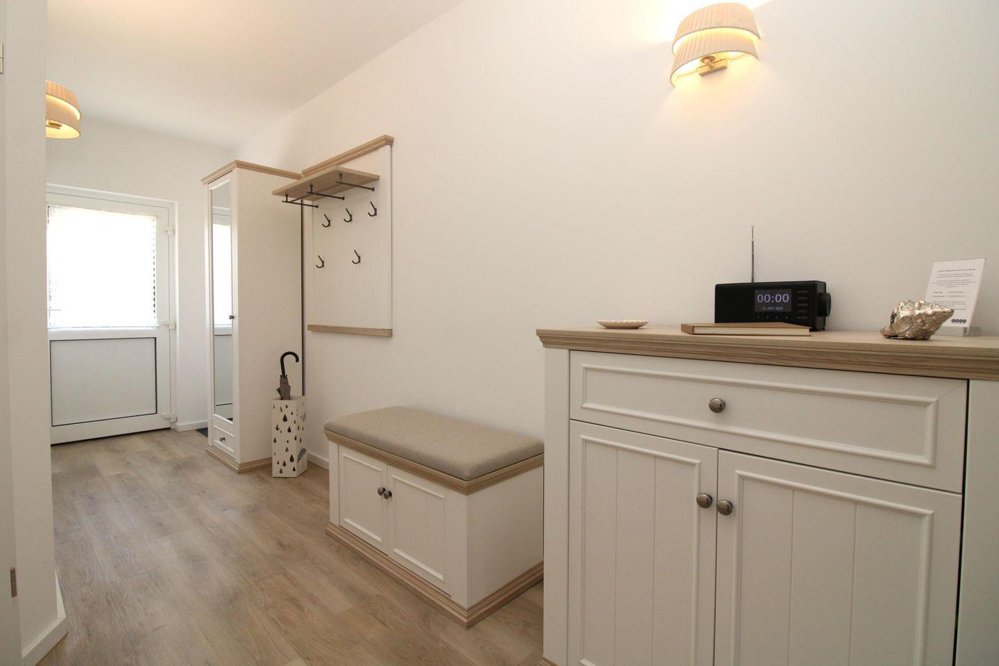 Vom Flur mit Garderobe, Sitzbank, Schrank, Schuhablage und Spiegel erreichen Sie bequem alle Räume Ihrer Ferienwohnung.