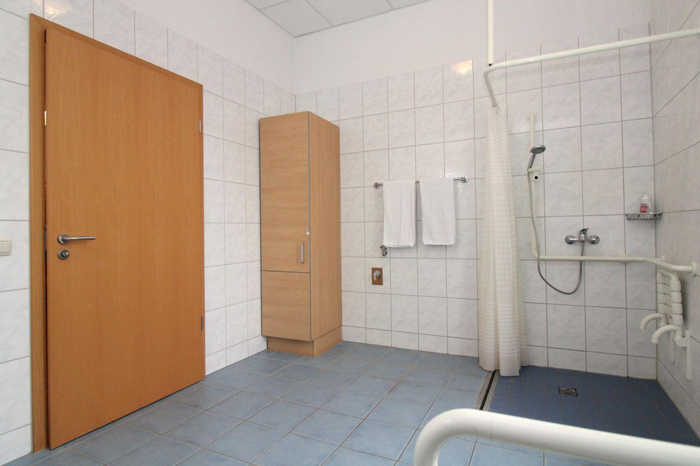 Ein fest in der Dusche integrierter Duschstuhl steht ebenfalls zur Verfügung. Das Waschbecken ist für Rollstuhlfahrer unterfahrbar, der Winkel des Wandspiegels ist verstellbar, damit sowohl sitzende als auch stehende Personen sich gut sehen können. Neben der Toilette befindet sich ein fest integrierter Haltegriff, auf der gegenüberliegenden Seite befindet sich ein klappbarer Griff.