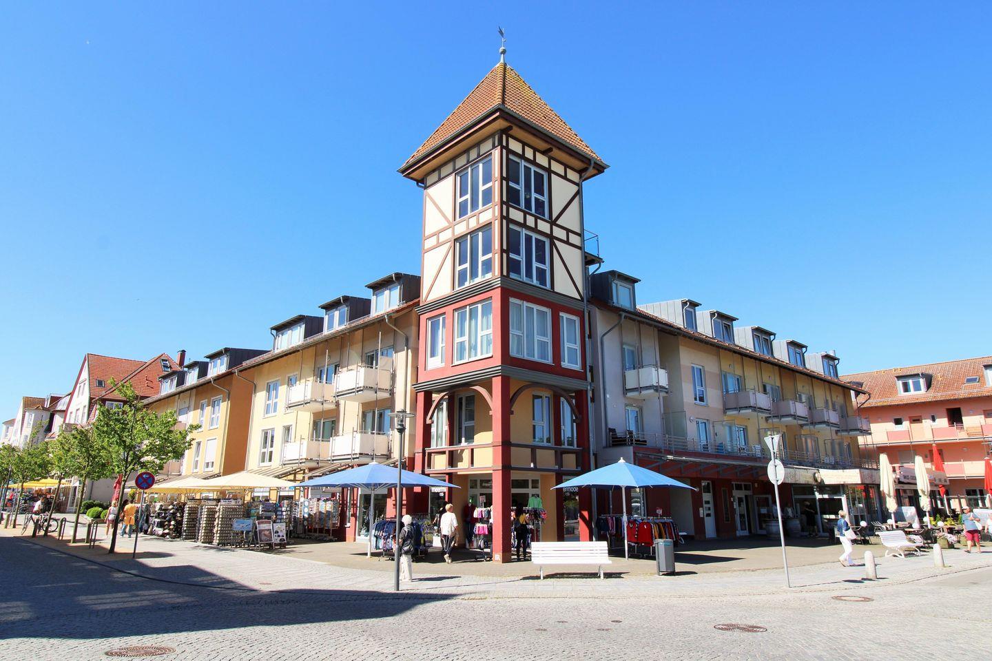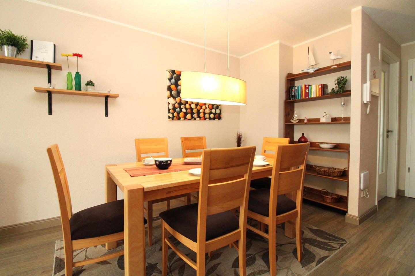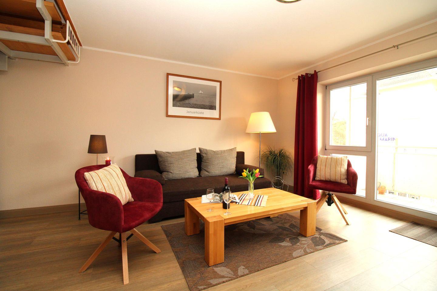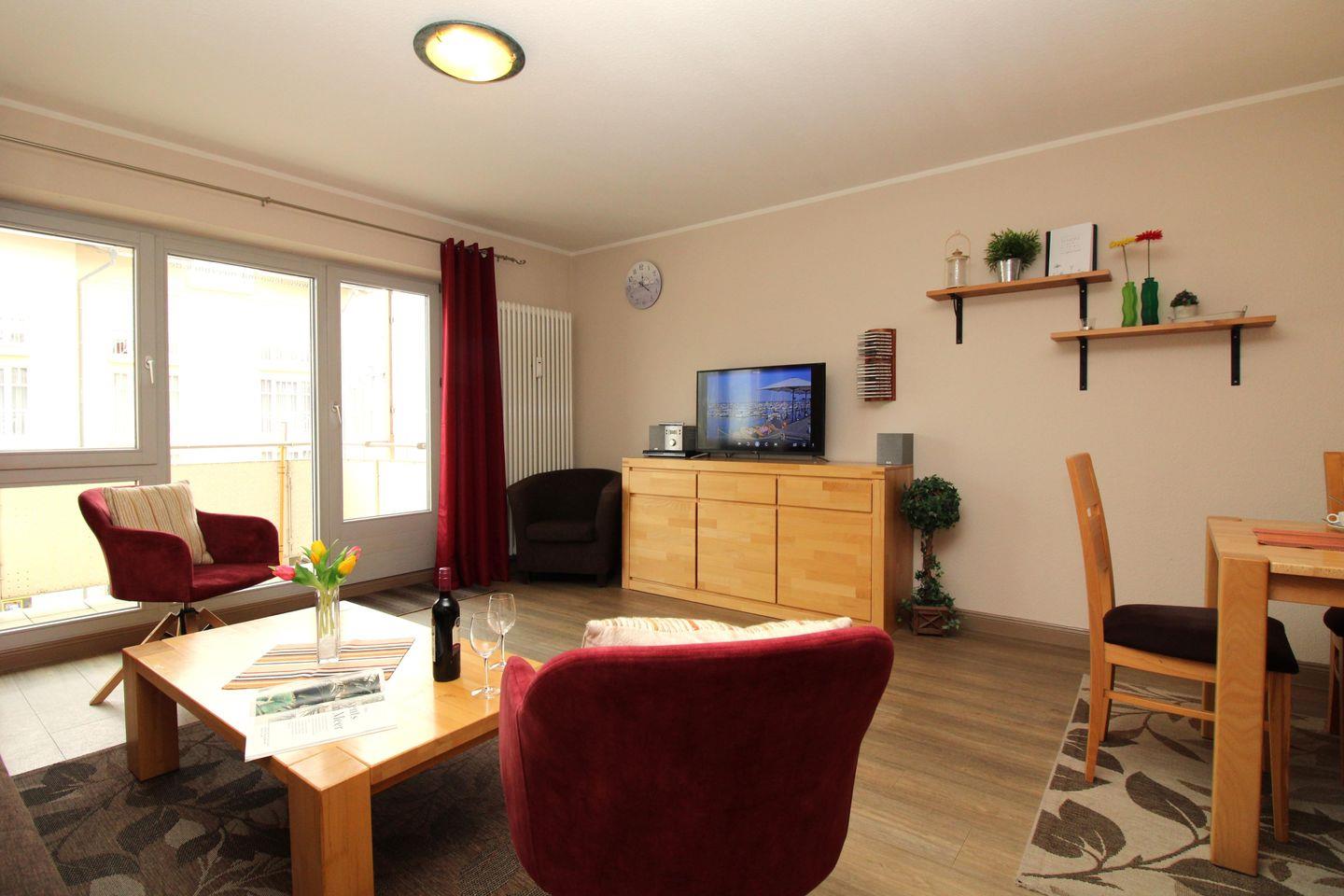 Das großzügige Wohn-/Esszimmer verfügt über eine separate Sitzecke mit bequemer (ausziehbarer Schlaf-) Couch, Couchtisch und 3 Sessel, einen separaten Esstisch mit 6 Stühlen sowie verschiedene Sideboards und Regale. Vom Wohnzimmer aus haben Sie Zugang zu dem Balkon mit Balkonmöbeln und unverbautem seitlichem Blick auf die Ostsee. Hier sitzen Sie entspannt und können das muntere Treiben auf der Ostseeallee verfolgen oder abends bei einem guten Glas Wein die lauen Sommernächte genießen!