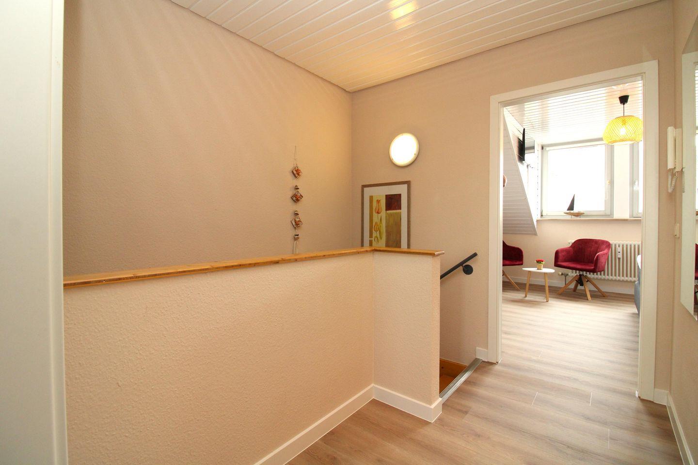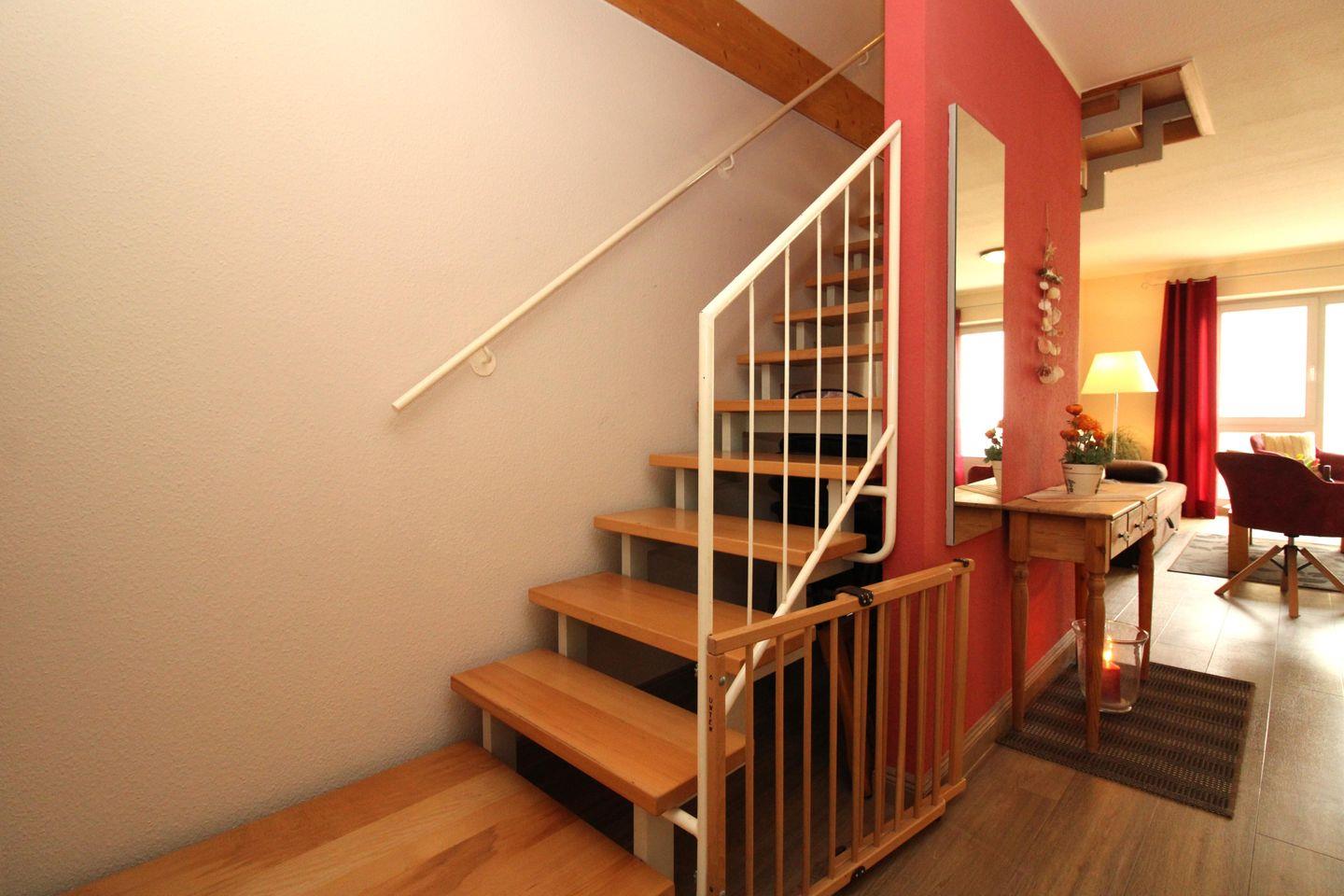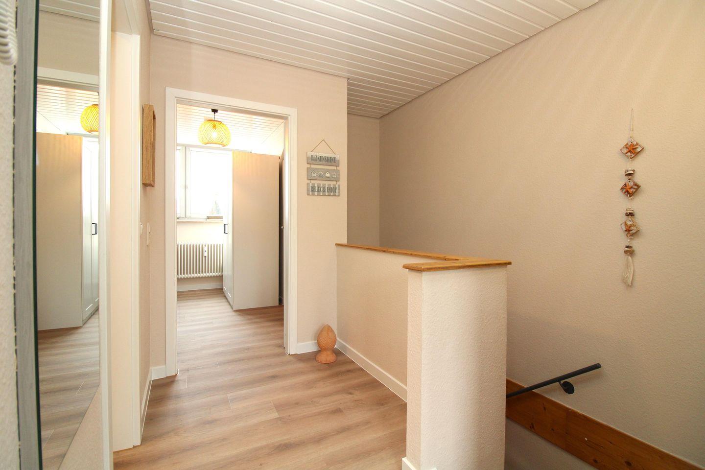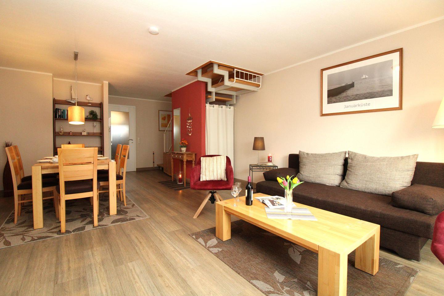 Die sehr strandnahe und großzügige 3-Zimmer-Wohnung (ca. 78 m²) im 2. und 3. Obergeschoss erstreckt sich mit einer innenliegenden Treppe über 2 Etagen und ist komplett eingerichtet. Der Bodenbelag im Wohn- und Schlafbereich ist hochwertiger Vinyl-Designbelag in edler Holzoptik, die Diele, Küche sowie Bad / WCs sind gefliest.