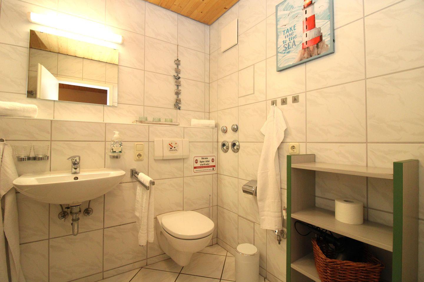 Das freundliche Badezimmer verfügt über eine Badewanne mit Duschabtrennung, Waschbecken, WC, Föhn, Handtuch-Heizkörper sowie ausreichend Ablagemöglichkeiten. In der unteren Etage befindet sich noch eine zusätzliche Gäste-Toilette mit Waschbecken, WC und Tageslicht (Fenster).