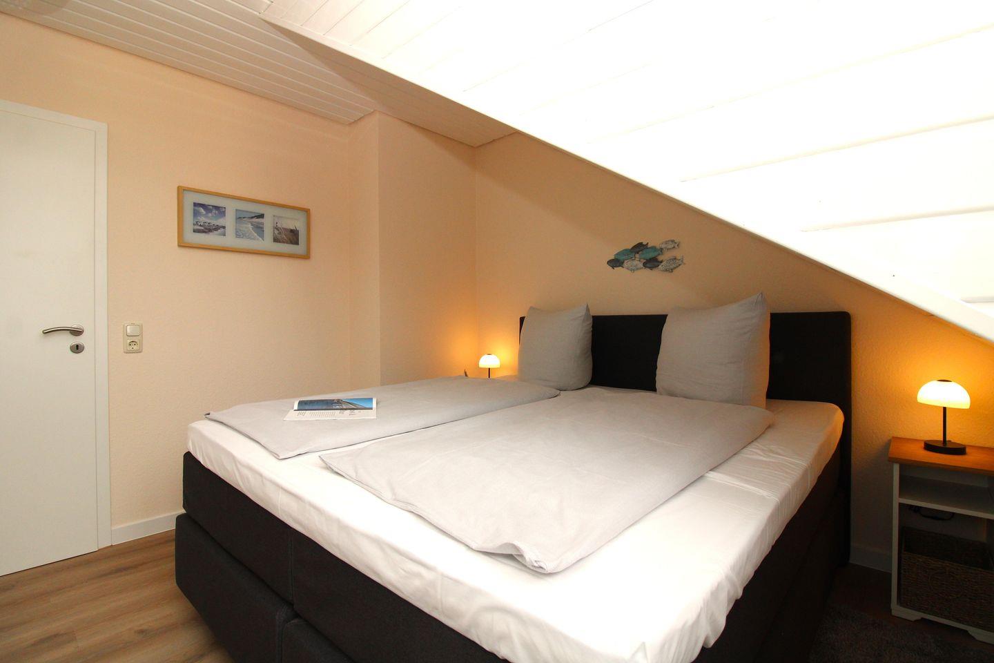 Das separate 2. Schlafzimmer ist ebenfalls mit einem bequemen Boxspring-Doppelbett (180 x 200 cm), Nachttischen sowie einem Kleiderschrank eingerichtet.