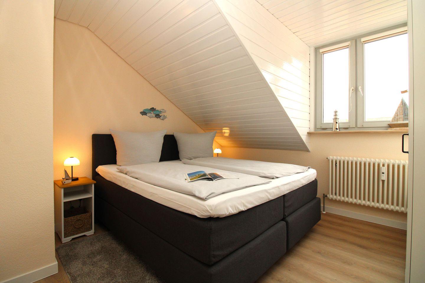 Das helle und freundliche 1. Schlafzimmer ist mit einem bequemen Boxspring-Doppelbett (180 x 200 cm), Nachttischen mit Lampen, einem geräumigen Kleiderschrank, einer Kofferablage sowie einem kleinen Tisch mit 2 Stühlen eingerichtet. Darüber hinaus verfügt dieses Zimmer über ein modernes Flachbild-TV-Gerät.