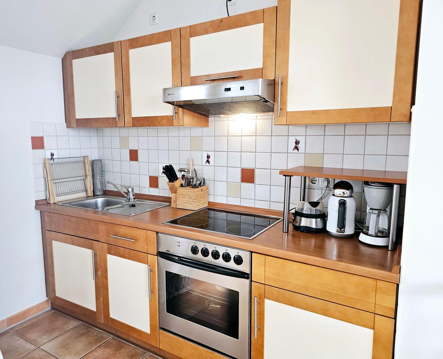 Diese liebevoll eingerichtete 2-Zimmer-Wohnung erstreckt sich über zwei Etagen und bietet auf rund 55 m² höchsten Wohnkomfort. Im unteren Bereich erwartet Sie ein gemütliches Schlafzimmer mit Doppelbett und Zugang zum Ostbalkon – perfekt für den ersten Kaffee in der Morgensonne. Das Badezimmer verfügt über eine Badewanne mit eleganter Duschabtrennung. Im Wohnzimmer steht Ihnen zusätzlich ein komfortables Schlafsofa (180 × 200 cm) zur Verfügung.