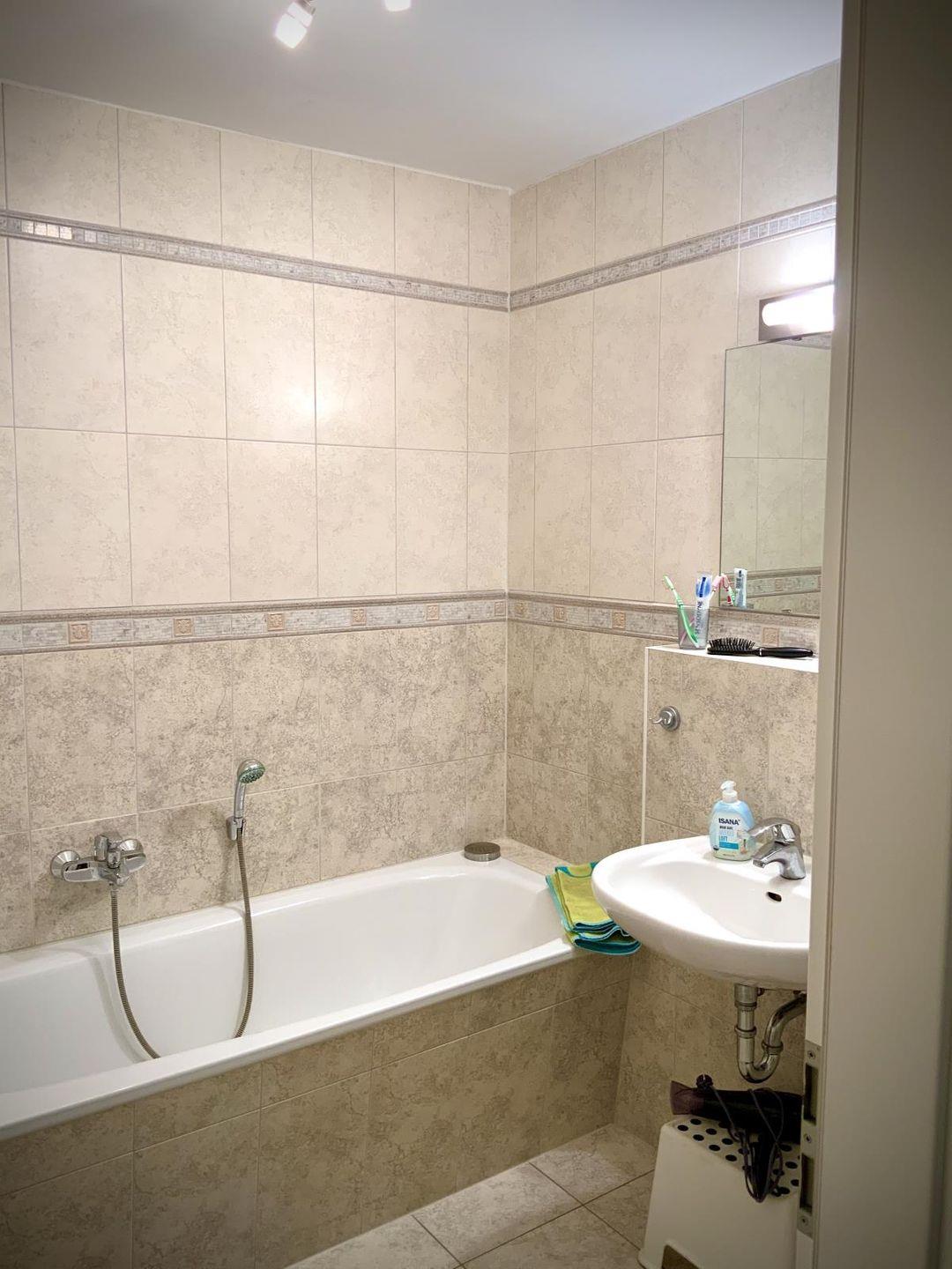 Das Badezimmer ist modern gefliest und verfügt über Badewanne, separate Dusche mit niedrigem Einstieg und viel Platz. Ein zusätzliches Gäste-WC sorgt für Extra-Komfort.