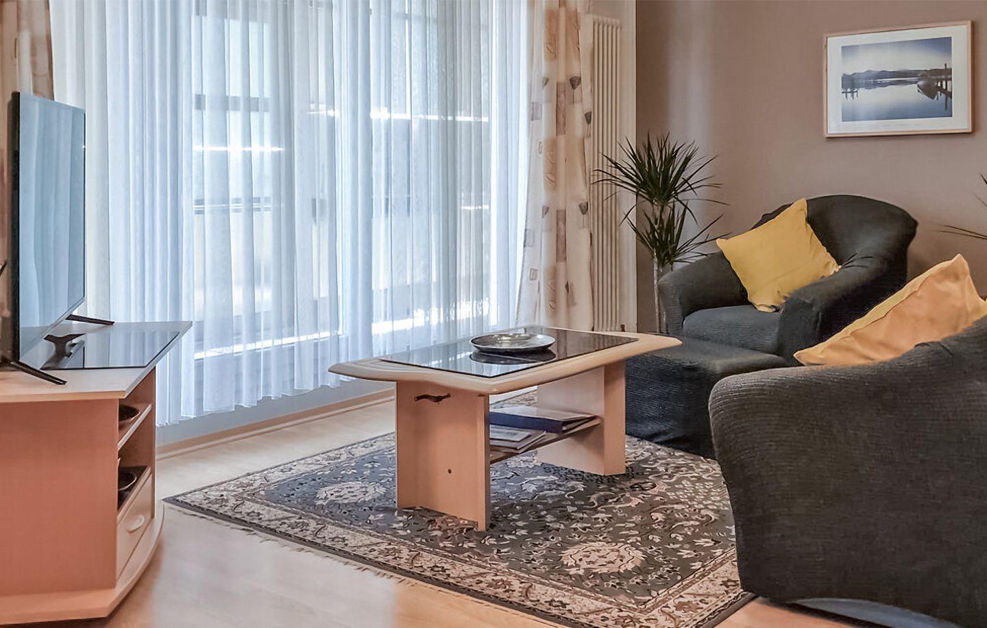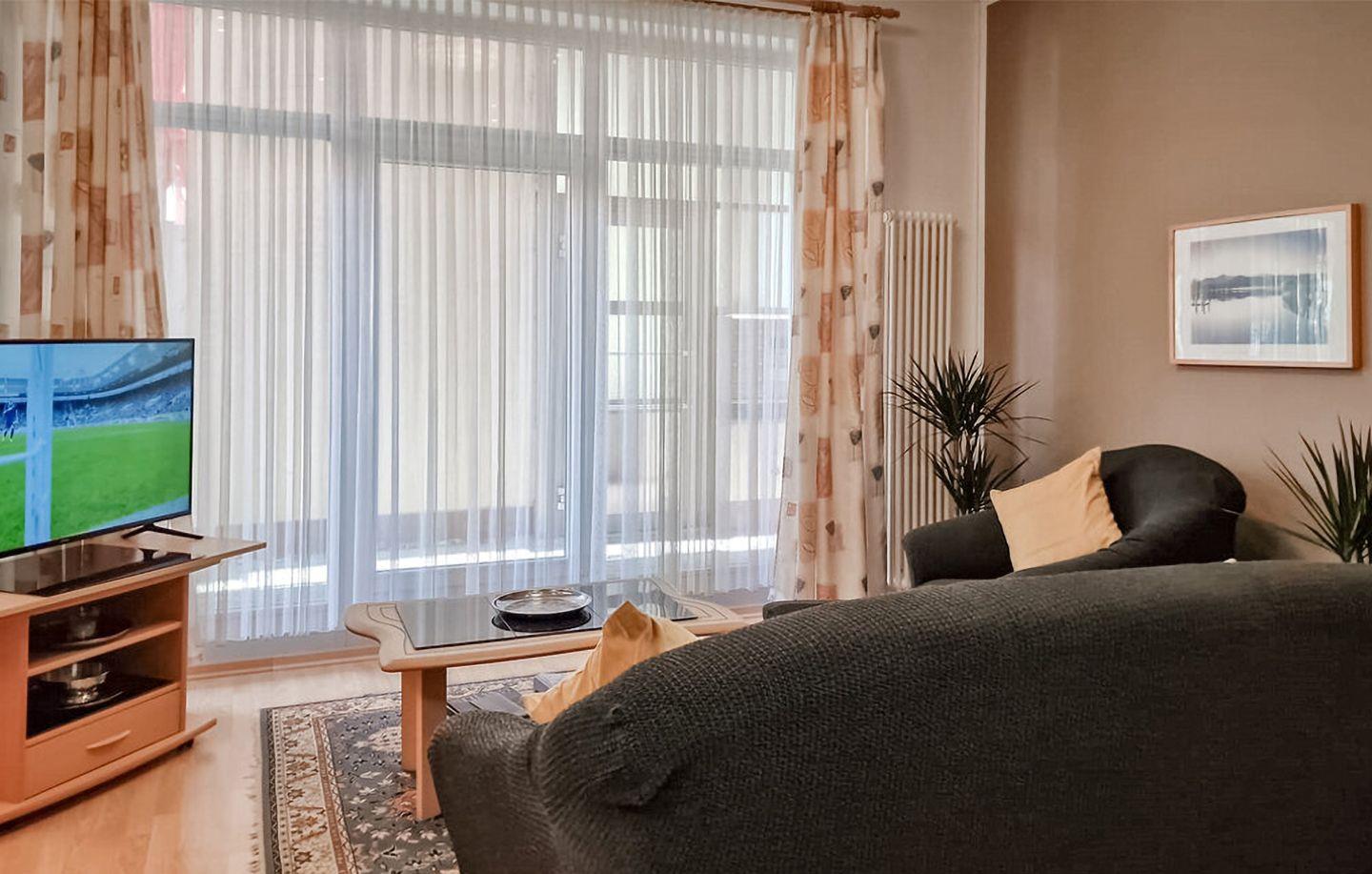 Die Wohnung im Erdgeschoss bietet Platz für bis zu vier Personen und ist funktional, gemütlich und wohnlich eingerichtet. Der kombinierte Wohn- und Essbereich mit integrierter Küche lädt zu gemeinsamen Mahlzeiten und entspannten Abenden ein. Zwei separate Schlafzimmer – eines mit Doppelbett, das andere mit zwei Einzelbetten – sorgen für angenehme Nächte nach einem Tag am Meer.