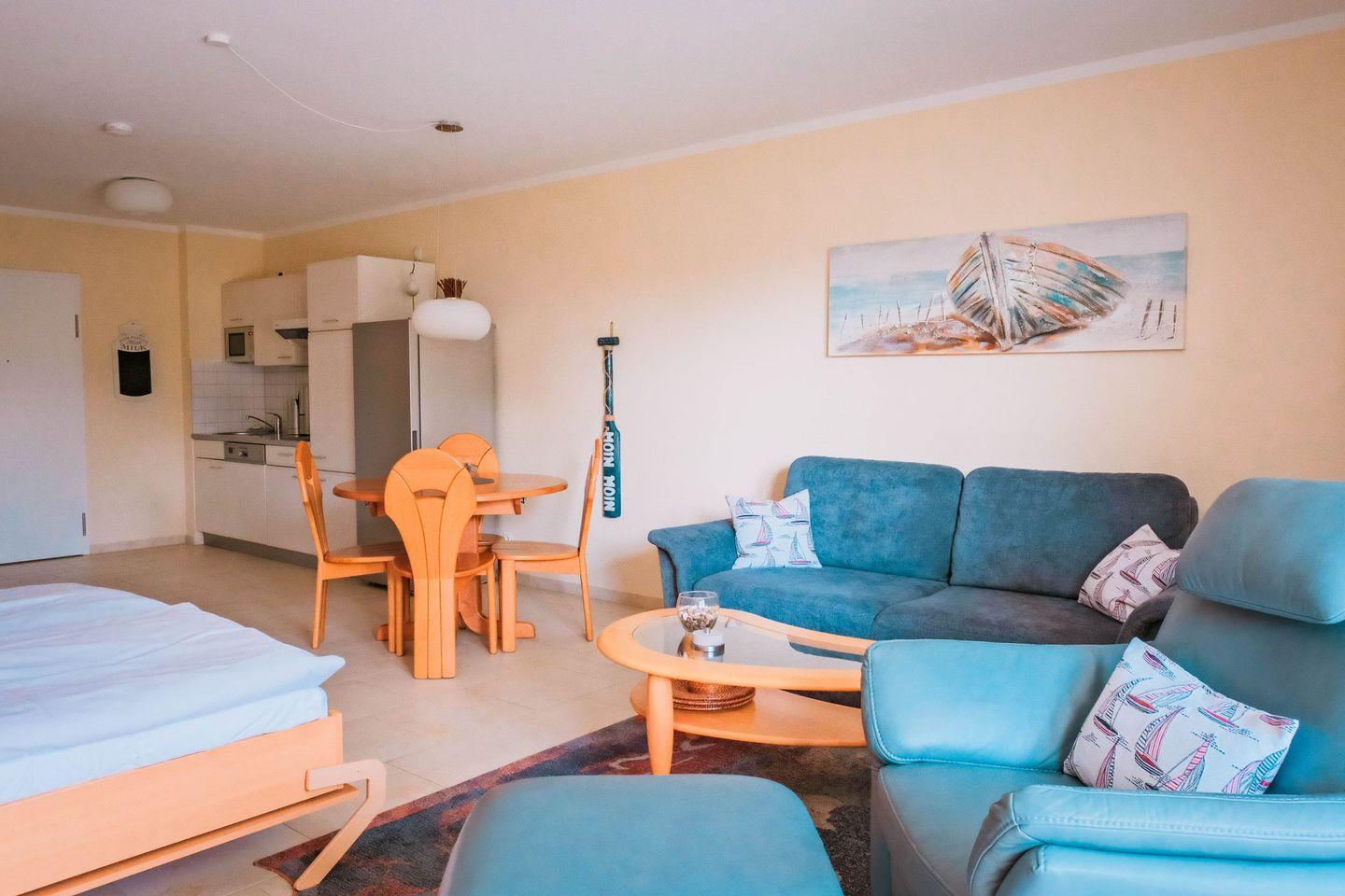 Die ca. 47 m² große 1-Raum-Ferienwohnung im ersten Obergeschoss bietet Platz für bis zu zwei Personen. Der helle Wohn- und Schlafbereich ist mit einem cleveren Schrank-Doppelbett (1,80 x 2,00 m) ausgestattet, das tagsüber verschwindet und so ein großzügiges Raumgefühl schafft. Liebevoll abgestimmte Farben und eine harmonische Einrichtung verleihen der Wohnung eine einladende, warme Atmosphäre – perfekt zum Entspannen nach einem Tag am Meer.