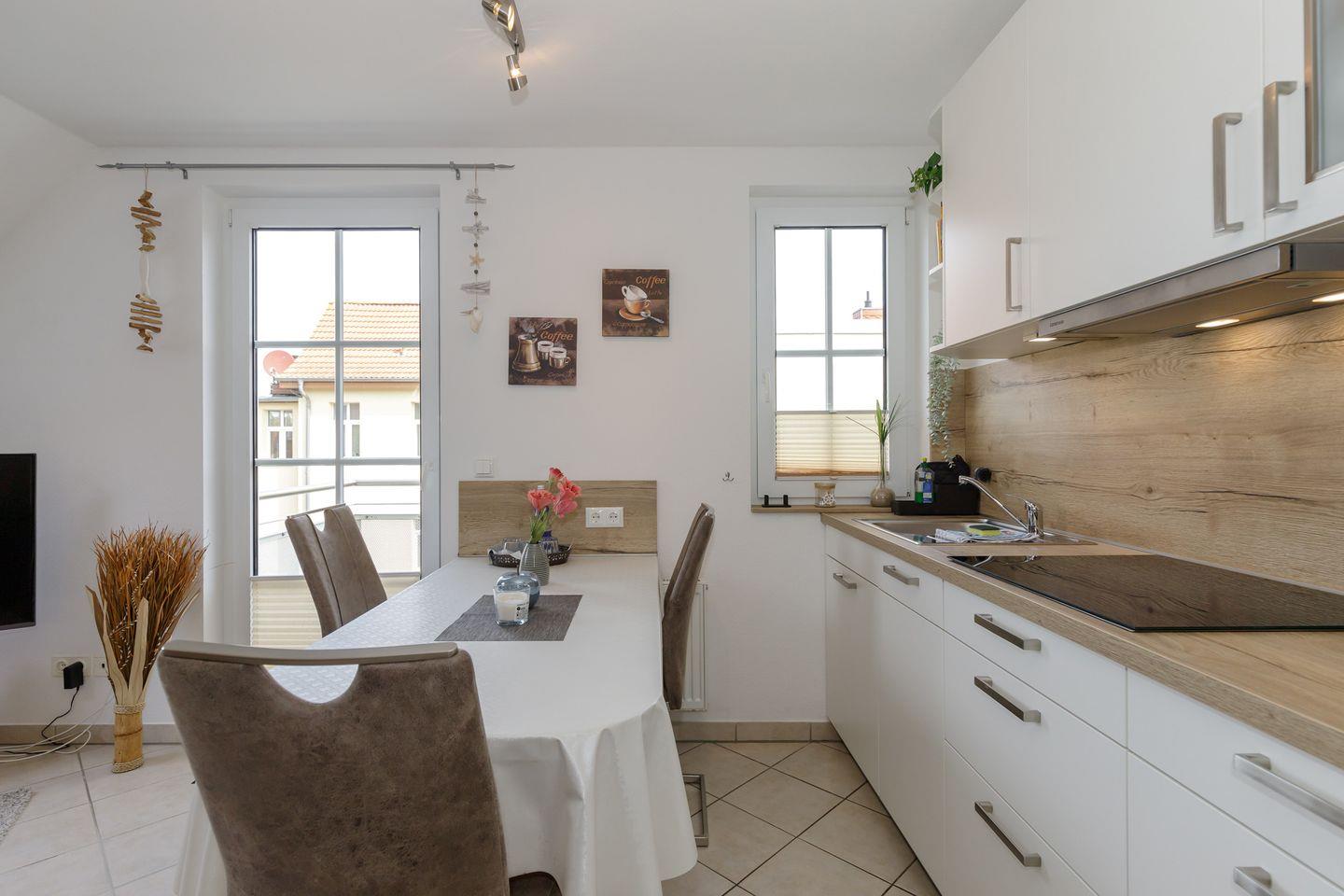 Der Wohnbereich ist behaglich gestaltet und bietet mit seiner großen Eckcouch (mit Schlaffunktion 1,40 x 2,00 m) und einem 55-Zoll-Flachbild-TV ideale Voraussetzungen für entspannte Stunden. Ein Radio, DVD-Player, Bücher und eine kleine Spielesammlung sorgen auch an Regentagen für Abwechslung. Die offene, frisch renovierte Küchenzeile ist perfekt ausgestattet – mit 4-Platten-Cerankochfeld, Backofen, Geschirrspüler, Kühlschrank mit Gefrierfach, Mikrowelle, Toaster und Wasserkocher. Der angrenzende Essbereich mit drei Stühlen lädt zum gemeinsamen Frühstück oder Abendessen ein.