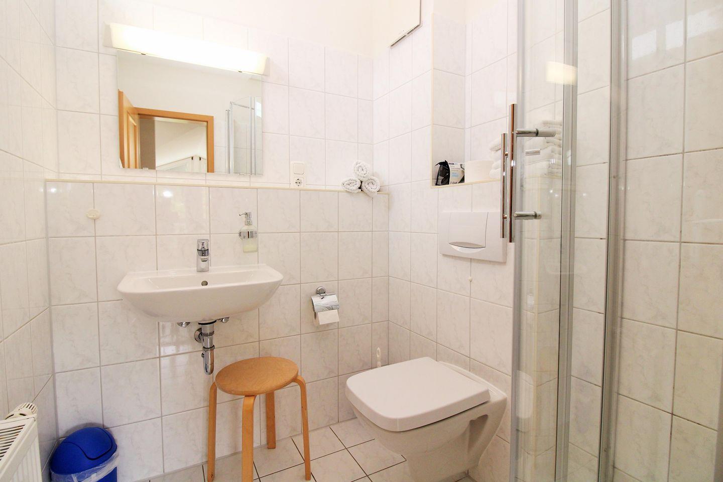 Das freundliche Badezimmer verfügt über eine moderne Echtglas-Dusche, Waschbecken, WC, Hocker sowie ausreichend Ablagemöglichkeiten.