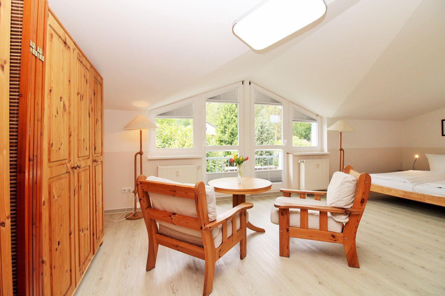 Das großzügige und helle 1. Schlafzimmer ist mit einem bequemen Doppelbett (2 x 90 cm x 200 cm), Nachttischen mit Nachttischlampen, 2 geräumigen Kleiderschränken, 2 Kommoden sowie einem separaten Sitzbereich mit 2 bequemen Sesseln und einem Couchtisch eingerichtet. Das Zimmer besitzt 2 große bodentiefe Fenster (französischer Balkon) mit freiem Blick ins Grüne.