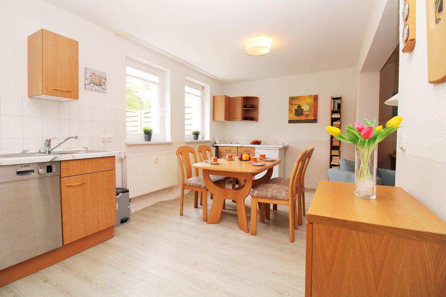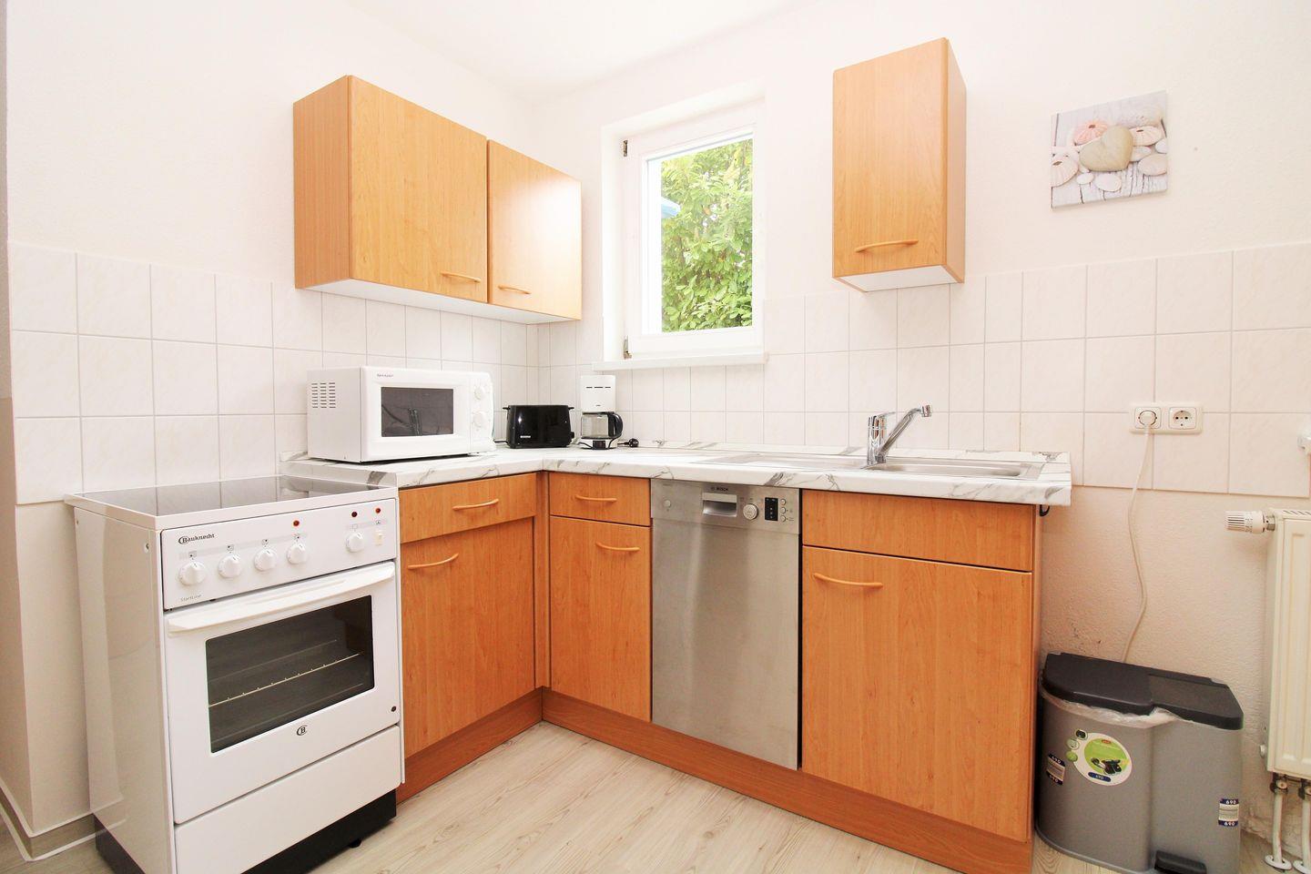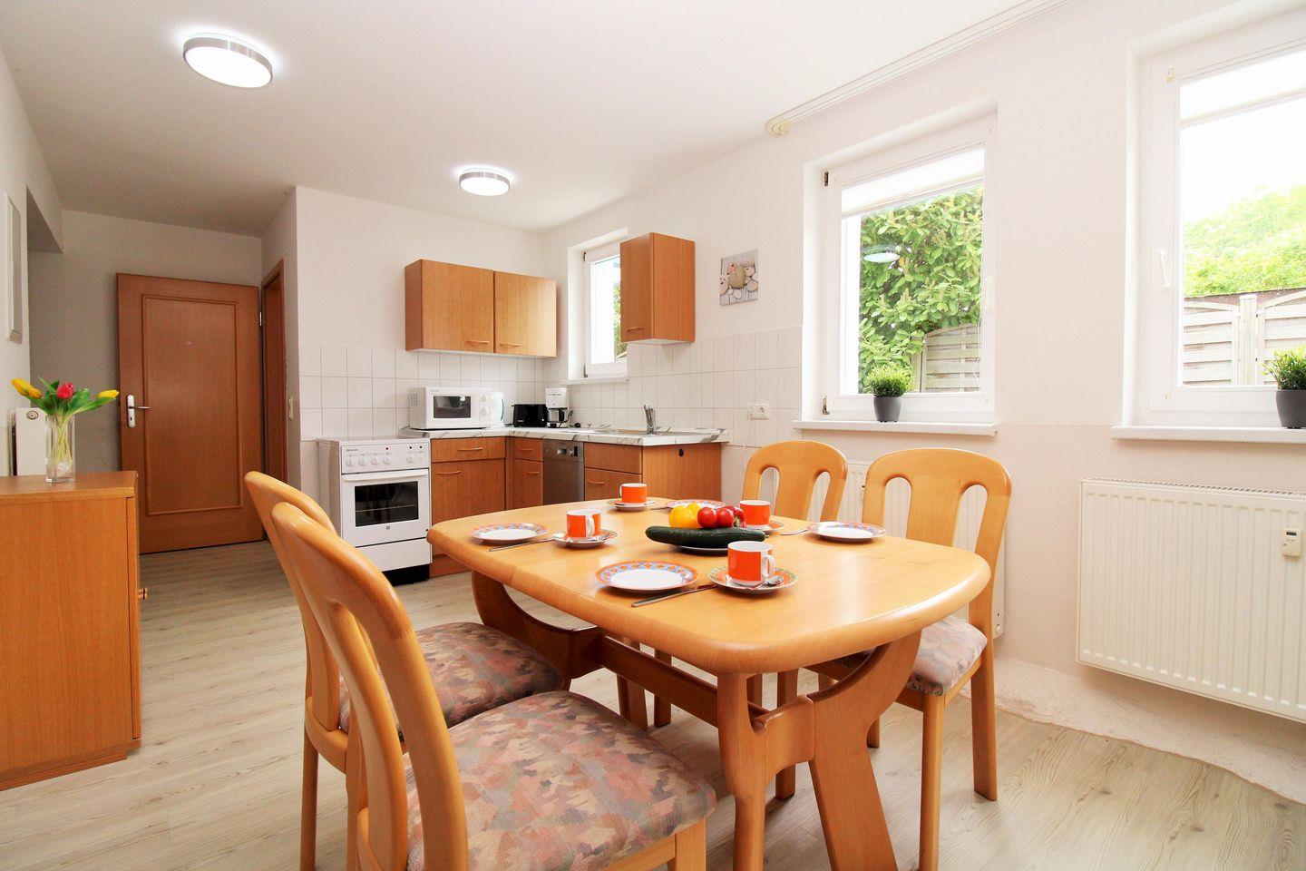 Die separate und offene Wohnküche beinhaltet eine voll ausgestattete Einbauküchenzeile mit 4-Zonen-Ceran-Kochfeld, Backofen, Dunstabzug, Mikrowelle, Kühlschrank mit Gefrierfach, Geschirrspülmaschine, Kaffeemaschine, Wasserkocher und Toaster sowie einen Esstisch mit 4 Stühlen. Die Küche ist mit Geschirr, Gläsern, Besteck und Töpfen komplett ausgestattet.