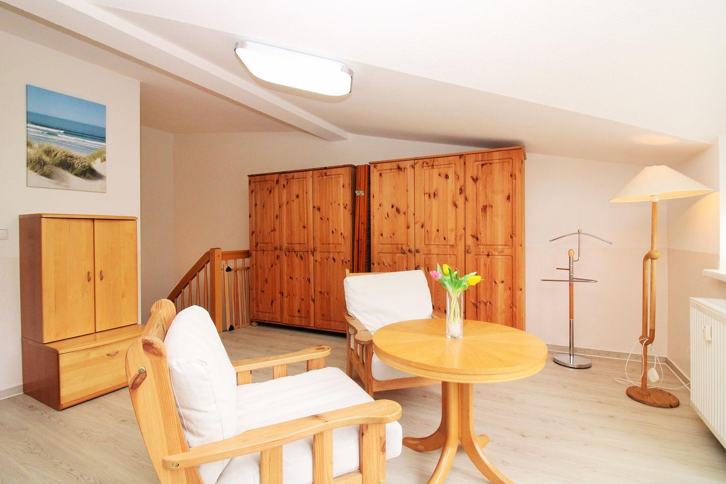 Die strandnahe, freundliche und sehr geräumige 3-Zimmer-Studiowohnung (ca. 74 m²) über 2 Etagen (mit innenliegender Treppe vom EG ins 1. OG) im hinteren Hausbereich des Gebäudes besitzt ein hohes Maß an Wohlfühlkomfort und ist komplett eingerichtet. Der Bodenbelag in allen Wohnräumen ist moderner Vinyl-Designbelag in edler Holzoptik, das Bad / WC ist gefliest.