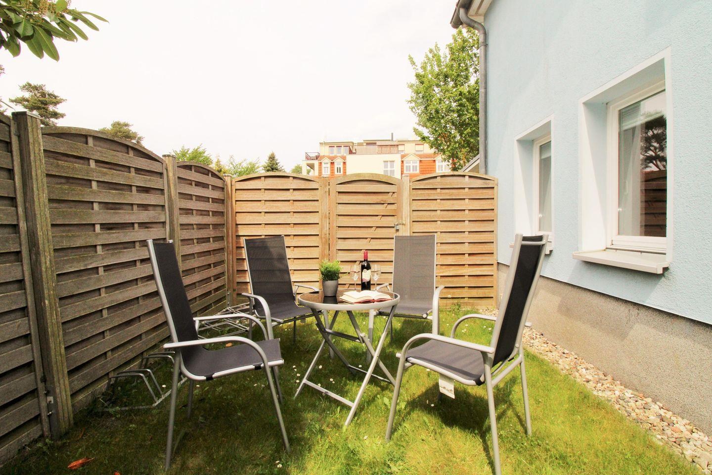 Die Wohnung verfügt direkt vor dem Eingangsbereich über einen ebenerdigen, ca. 15 m² großen Garten-bzw. Rasenbereich mit Gartenmöbeln. Hier sitzen Sie entspannt und gemütlich im Grünen und können abends bei einem guten Glas Wein in Ruhe die lauen Sommernächte genießen!