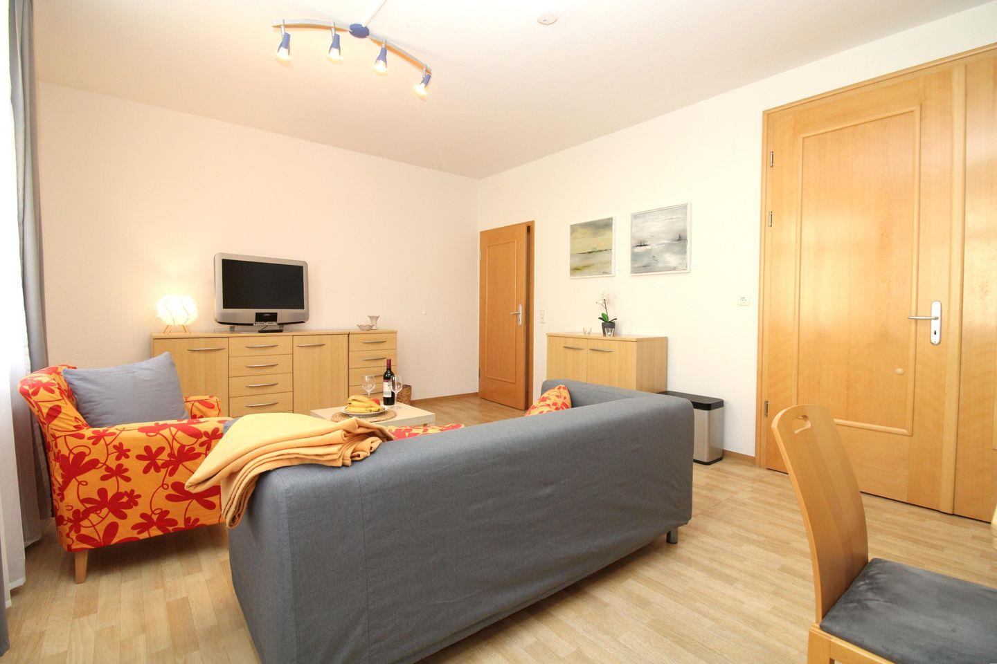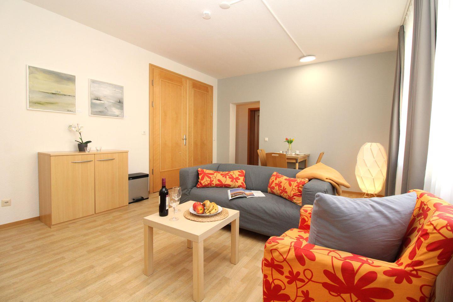 Die strandnahe, moderne und freundliche 2-Zimmer-Wohnung (ca. 45 m²) im Erdgeschoss besitzt ein hohes Maß an Wohlfühlkomfort und ist komplett eingerichtet. Der Bodenbelag in den Wohnräumen ist hochwertiges Holzlaminat, das Bad / WC ist gefliest.