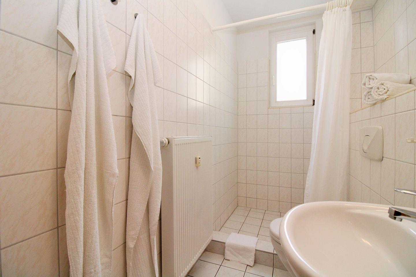 Das freundliche Badezimmer (mit Tageslicht / Fenster) verfügt über eine begehbare Dusche, Waschbecken, WC sowie ausreichend Ablageflächen.