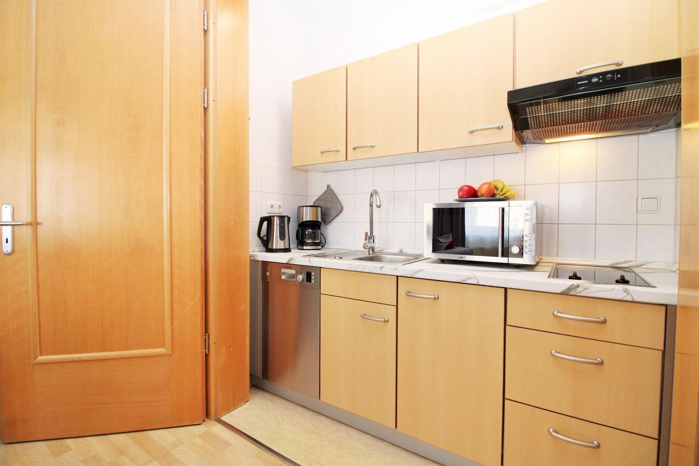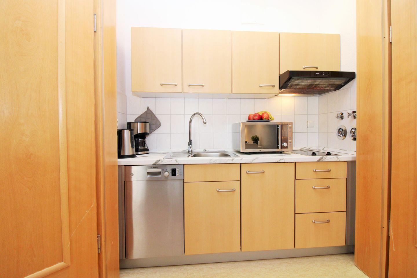 Die durch 2 große Flügeltüren abgetrennte Pantryküche beinhaltet eine voll ausgestattete Einbauküchenzeile mit 2-Zonen-Ceran-Kochfeld, Dunstabzug, Mikrowelle mit Backfunktion, Kühlschrank, Geschirrspülmaschine, Kaffeemaschine, Wasserkocher und Toaster. Die Küche ist mit Geschirr, Gläsern, Besteck und Töpfen komplett ausgestattet.