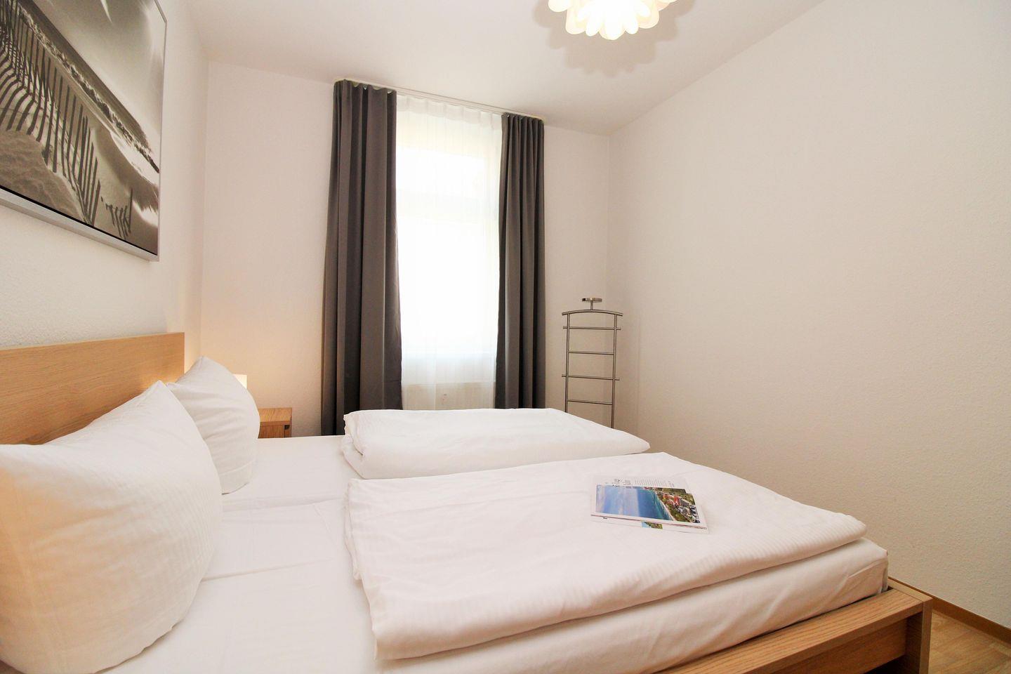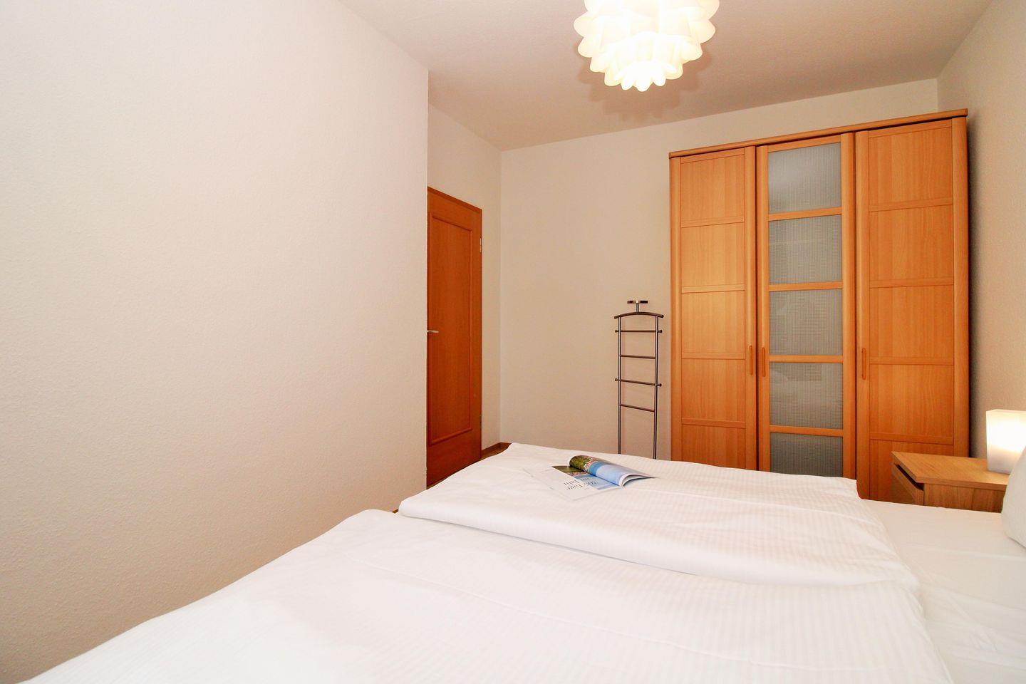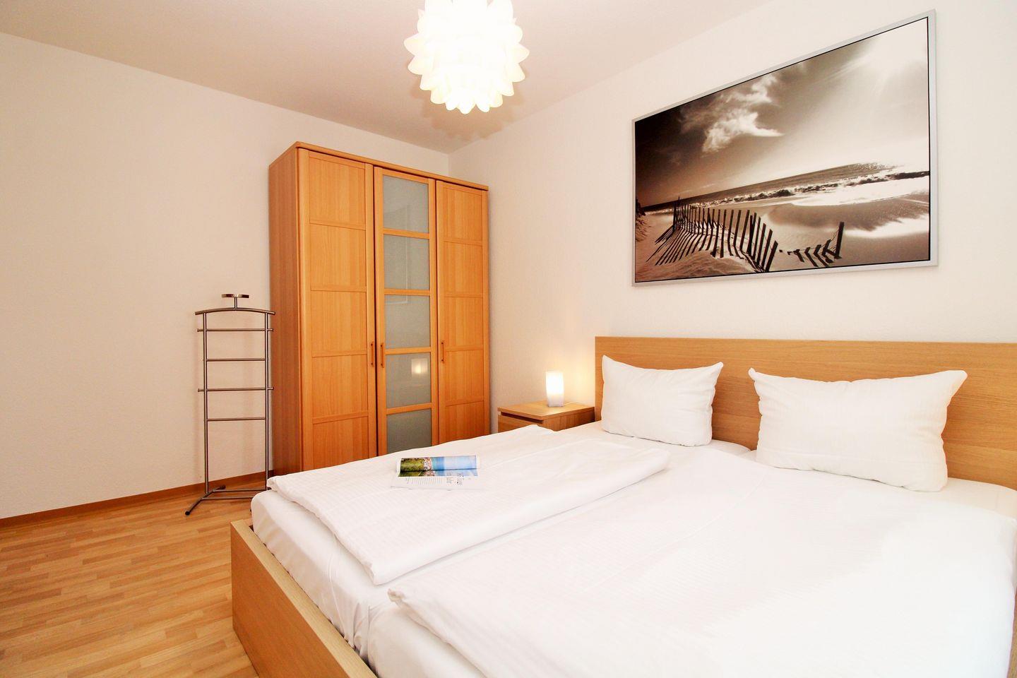 Das moderne Schlafzimmer ist mit einem bequemen Doppelbett (2 x 90 cm x 200 cm), Nachttischen mit Nachttischlampen sowie einem geräumigen Kleiderschrank eingerichtet.