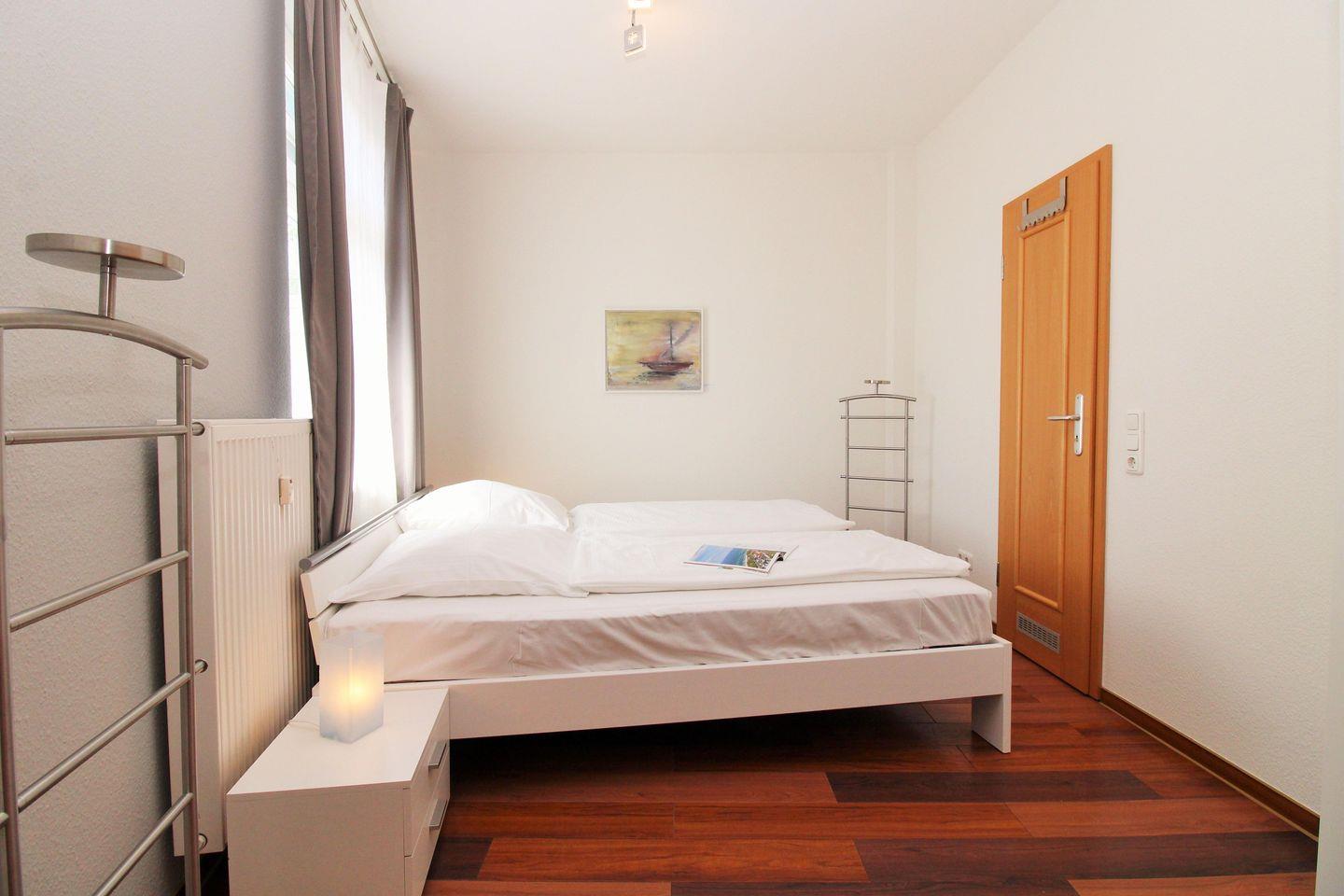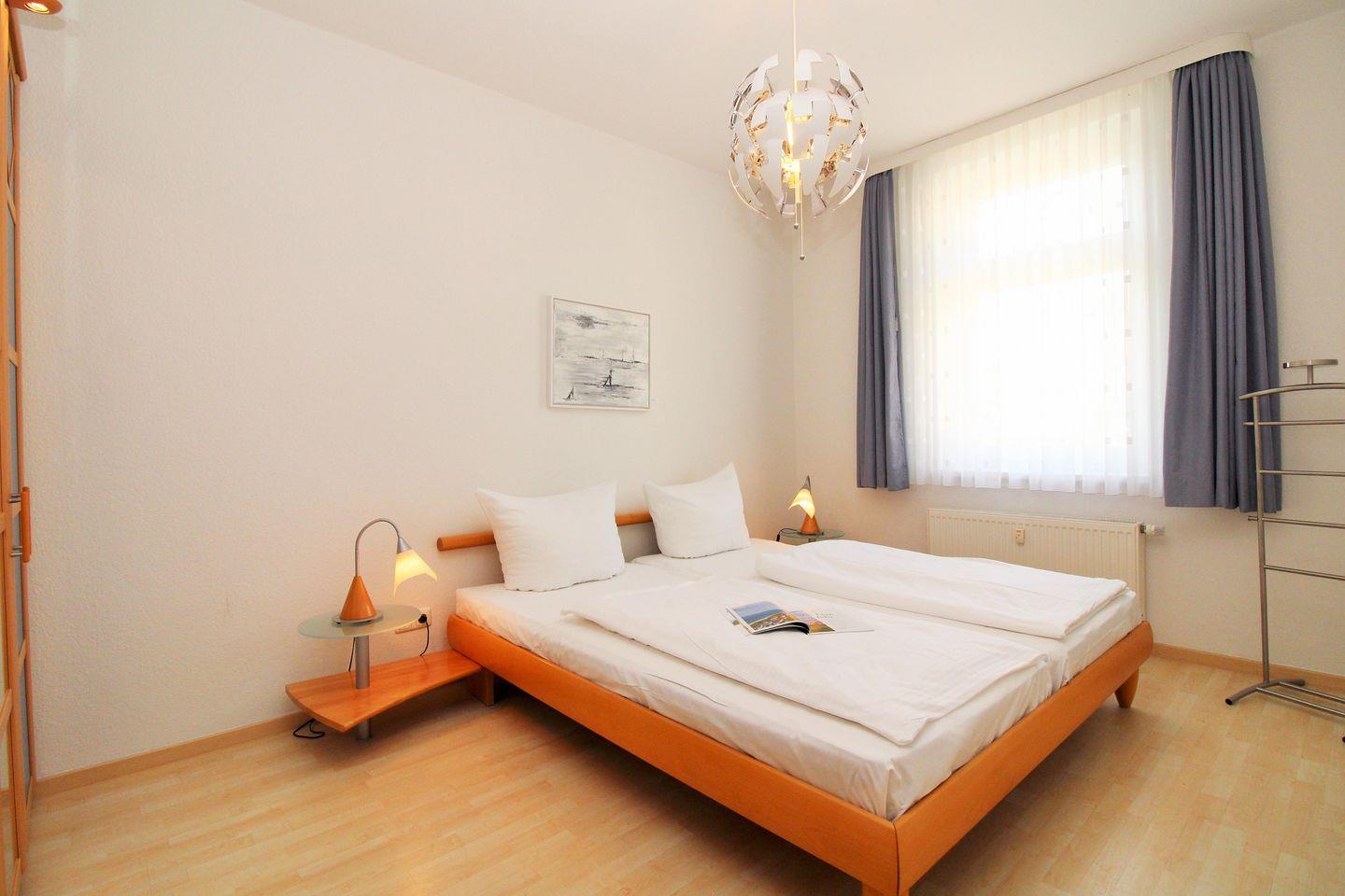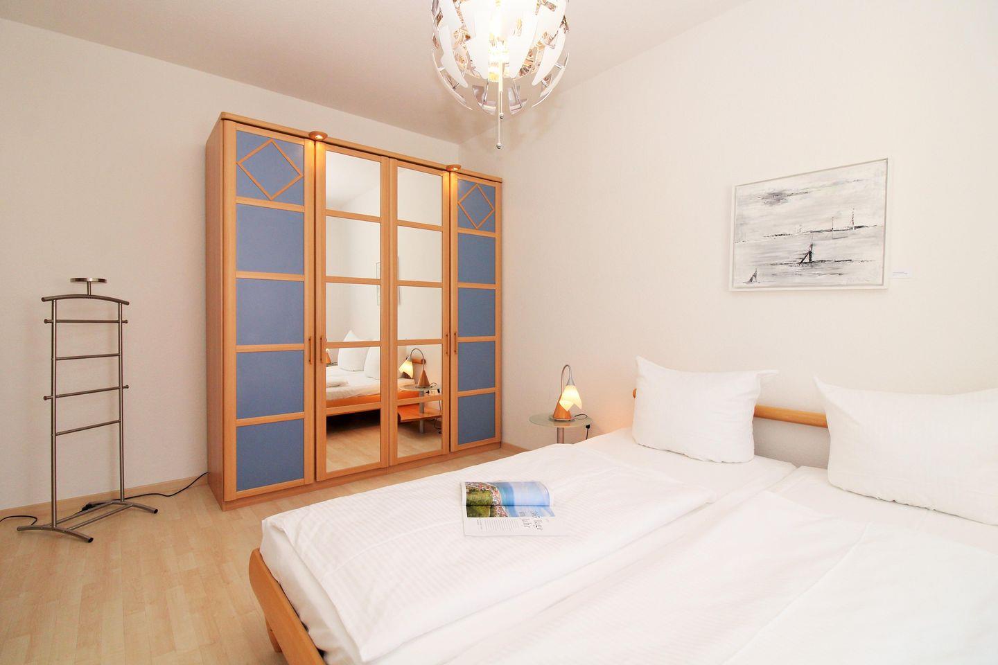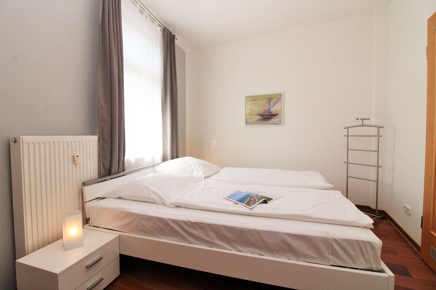 Das moderne und helle 1. Schlafzimmer ist mit einem bequemen Doppelbett (2 x 90 cm x 200 cm), Nachttischen mit Nachttischlampen sowie einem Kleiderschrank eingerichtet.