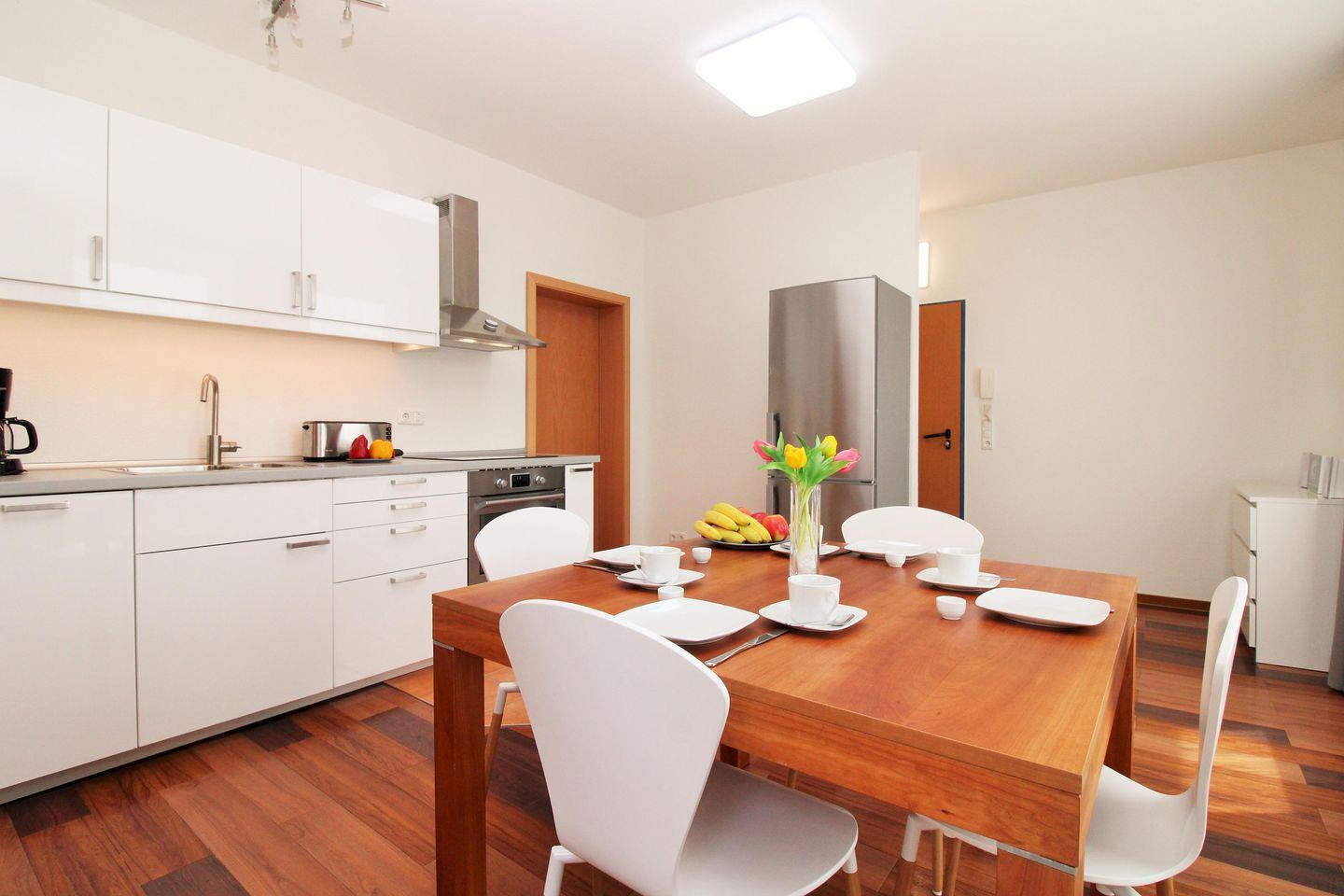 Die separate und geräumige Wohnküche beinhaltet eine voll ausgestattete Einbauküchenzeile in gehobener Ausstattung mit 4-Zonen-Ceran-Kochfeld, Dunstabzug, Mikrowelle mit Backofen, Kühlschrank, Gefrierschrank, Geschirrspülmaschine, Kaffeemaschine, Wasserkocher und Toaster. Darüber hinaus steht Ihnen hier ebenfalls ein Radio sowie ein CD-Player zur Verfügung. Die Küche ist mit Geschirr, Gläsern, Besteck und Töpfen komplett ausgestattet. Von der Küche aus haben Sie direkten Zugang zu dem ca. 6 m² großen und sonnigen Balkon (nach Süden ausgerichtet) mit Balkonmöbeln. Hier sitzen Sie entspannt und gemütlich im Grünen und können abends bei einem guten Glas Wein die lauen Sommernächte genießen!