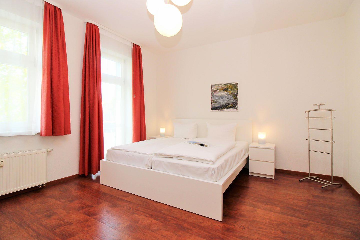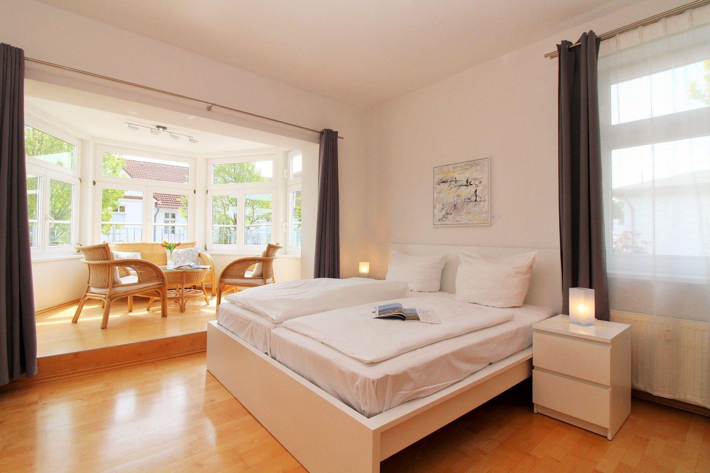 Das moderne und lichtdurchflutete 1. Schlafzimmer ist mit einem bequemen Doppelbett, Nachttischen, 2 geräumigen Kleiderschränken sowie einer Kommode eingerichtet. Besonders hervorzuheben ist in diesem Raum eine separate und in einem Erker räumlich etwas abgetrennte gemütliche Sitzgruppe mit bequemen Korbmöbeln. Zu Ihrer Unterhaltung steht Ihnen hier ebenfalls eine Stereoanlage mit Radio und CD-Player zur Verfügung.