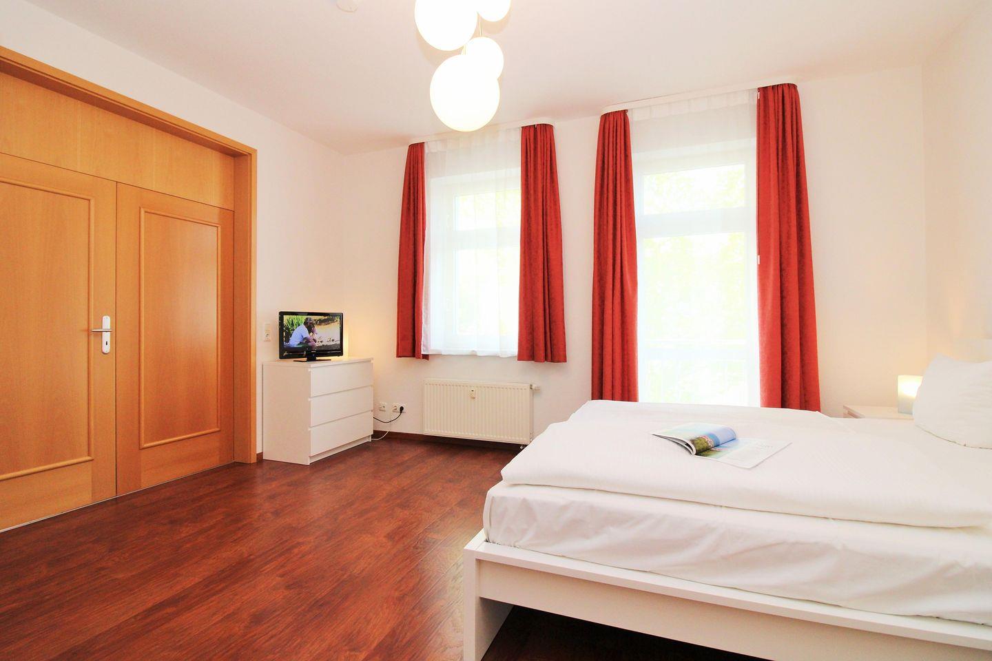 Das geräumige und gemütliche 2. Schlafzimmer ist ebenfalls mit einem bequemen Doppelbett, Nachttischen, einem großen Kleiderschrank sowie einer Kommode eingerichtet. Darüber hinaus steht Ihnen hier ein weiteres zusätzliches TV-Gerät zur Verfügung.