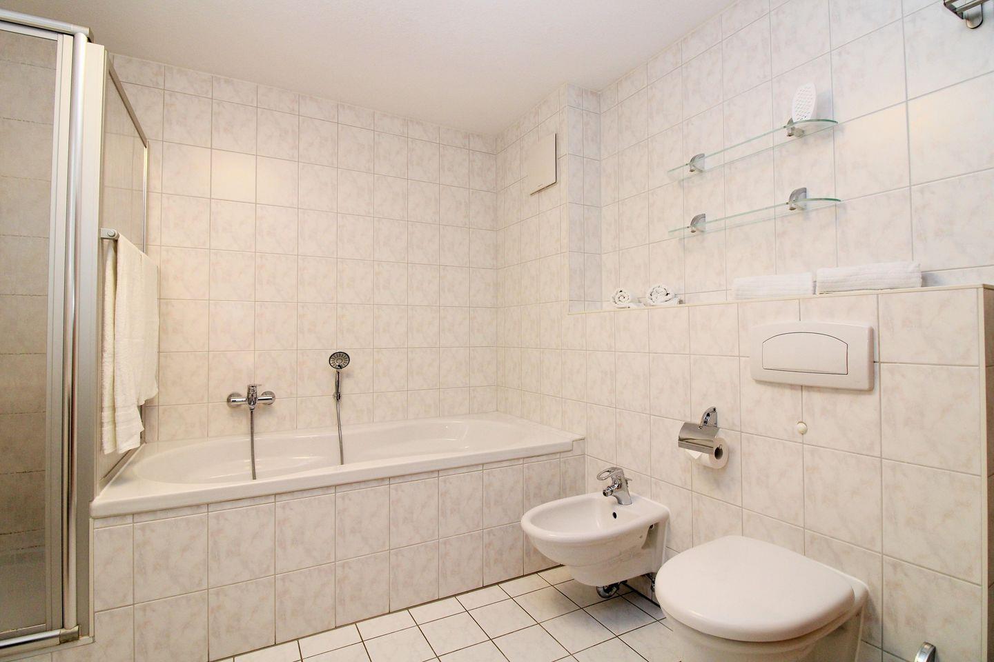Das geräumige Badezimmer verfügt über eine Badewanne, eine Dusche, Waschbecken mit Unterschrank, WC, Bidet, Kosmetikspiegel, einen Handtuchheizkörper sowie ausreichend Ablageflächen.