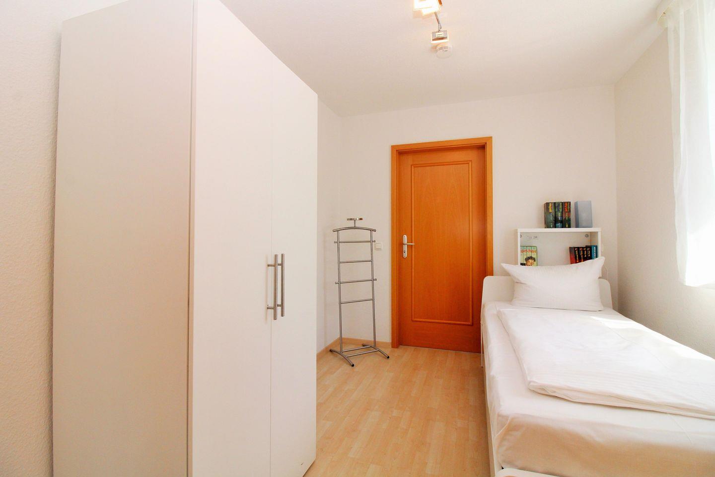 Das separate 3. Schlafzimmer ist mit einem bequemen Einzelbett, einem Kleiderschrank sowie einem Regal eingerichtet.