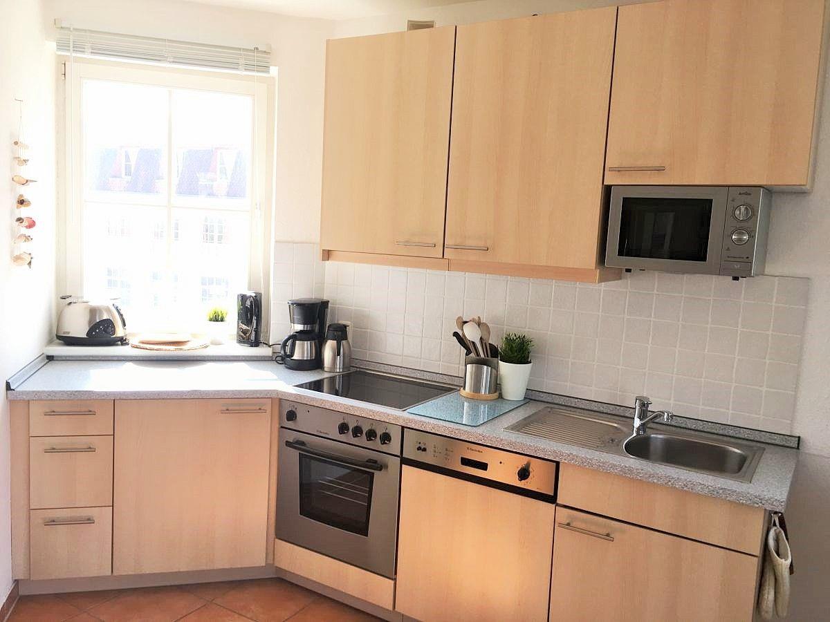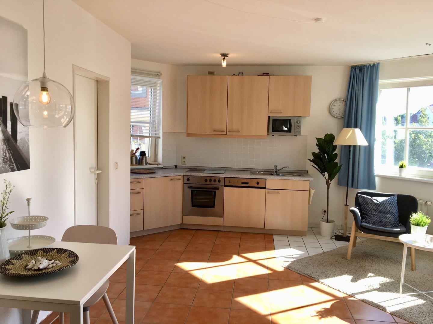 Der offene Küchenbereich beinhaltet eine voll ausgestattete Einbauküchenzeile mit 4-Zonen-Ceran-Kochfeld, Backofen, Dunstabzug, Mikrowelle, Kühlschrank, Geschirrspülmaschine, Kaffeemaschine, Wasserkocher und Toaster. Die Küche ist mit Geschirr, Gläsern, Besteck und Töpfen komplett ausgestattet.