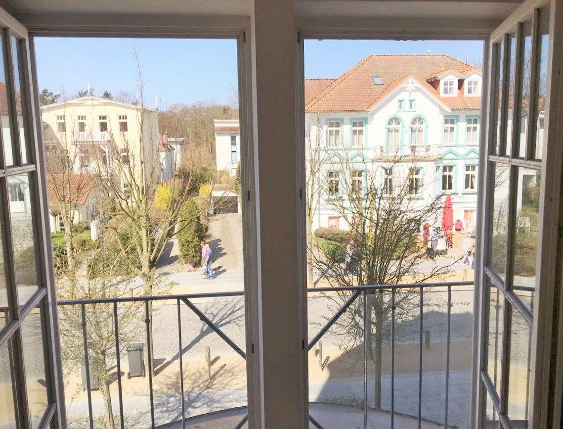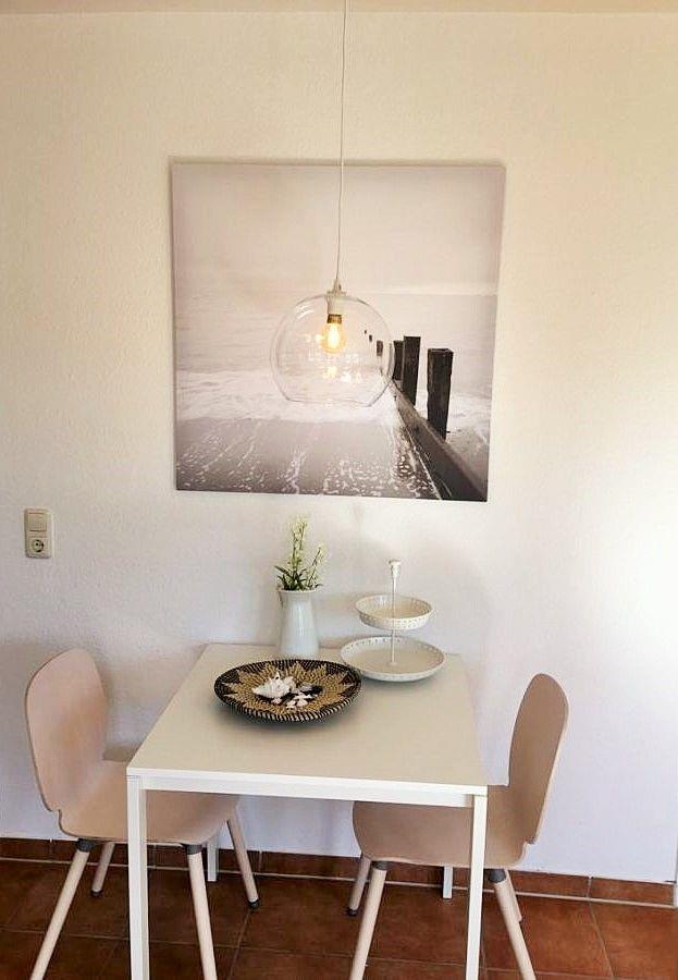 Der helle und moderne Wohn-/Essbereich verfügt über 2 bequeme Sessel mit einem kleinen Couchtisch sowie einen separaten Esstisch mit 2 Stühlen. Von hier aus können Sie durch den französischen Balkon mit seinen raumhohen Fenstern den herrlichen Rundum-Blick mit dem munteren Treiben auf der Strandstraße genießen.