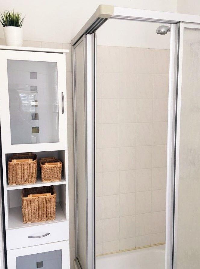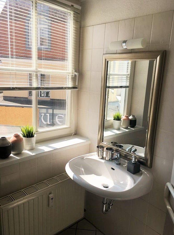 Das helle Badezimmer (mit Tageslicht / Fenster) verfügt über eine Dusche, Waschbecken und WC sowie ausreichend Ablagemöglichkeiten.