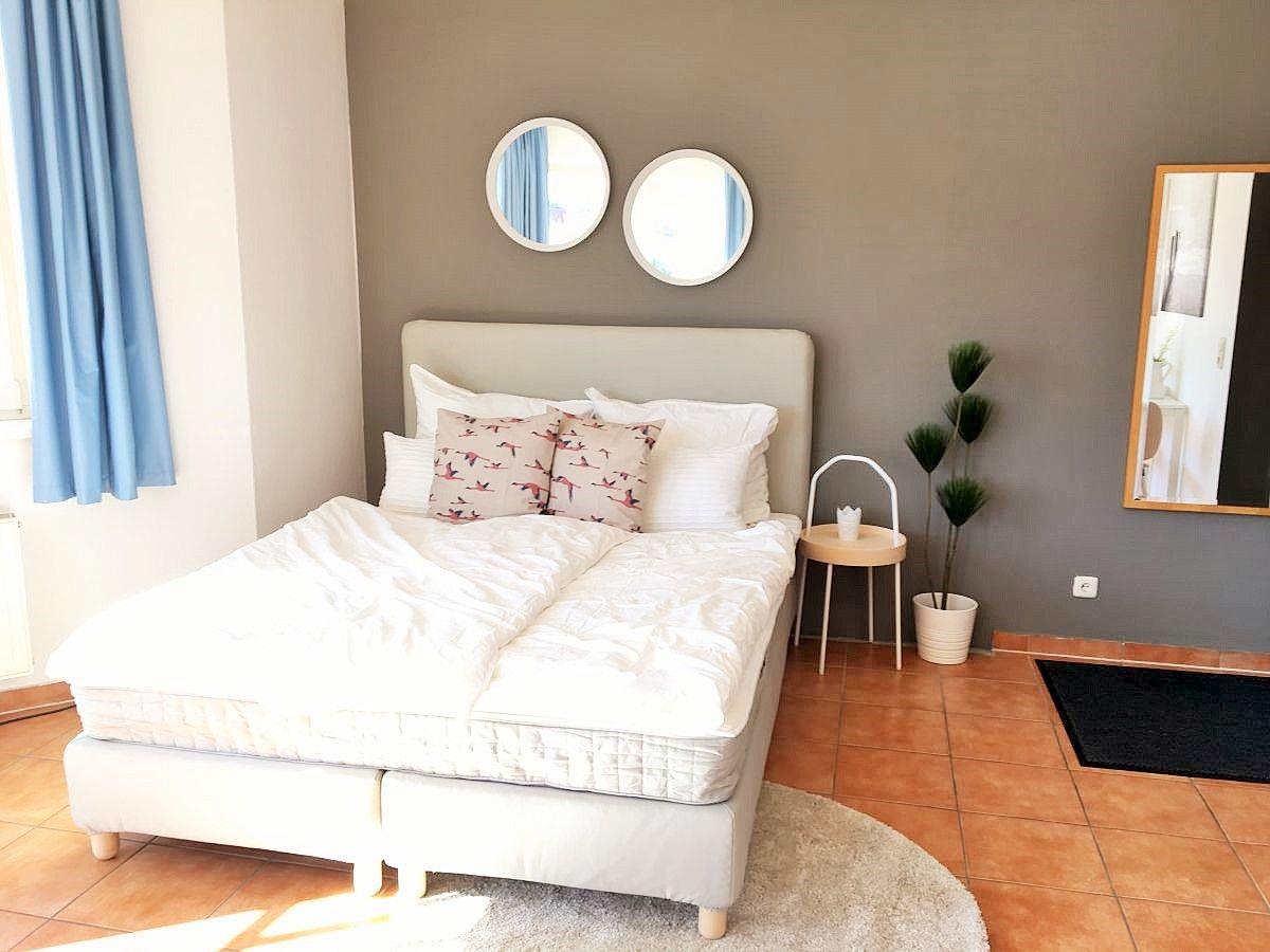 Im Schlafbereich steht Ihnen ein bequemes Boxspringbett (1,60 m breit) zur Verfügung. Für einen guten Schlafkomfort verfügt das Appartement über Verdunkelungsvorhänge.