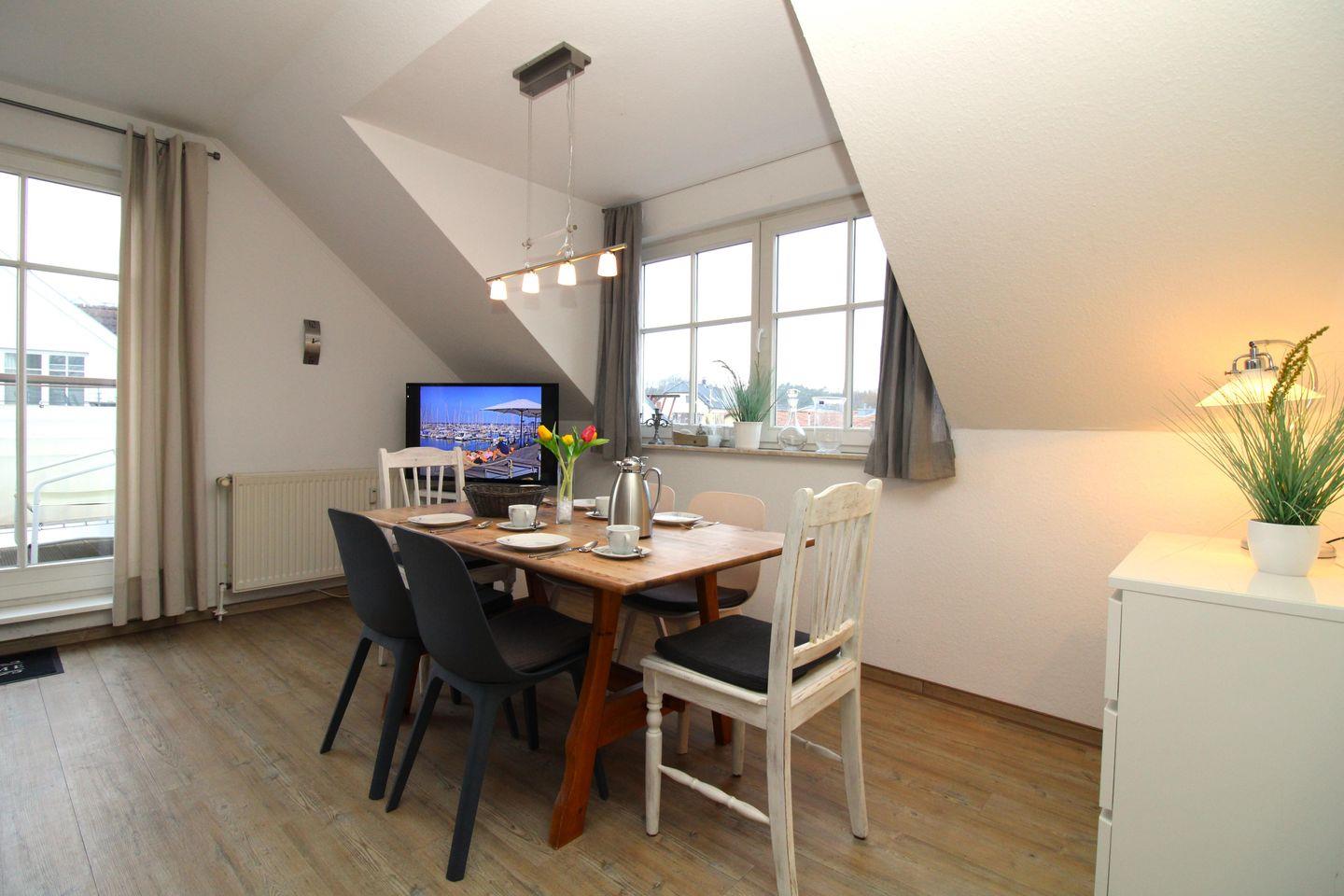 Das helle und freundliche Wohn-/Esszimmer verfügt über eine separate Sitzgruppe mit bequemer Couch und Couchtisch, einen separaten Esstisch mit 6 Stühlen sowie eine Kommode. Vom Wohnzimmer aus haben Sie direkten Zugang zu dem ca. 8 m² großen und sonnigen Balkon (nach Süden und Westen ausgerichtet) mit verschiedenen Balkonmöbeln - hier sitzen Sie entspannt und gemütlich im Grünen und können abends bei einem guten Glas Wein in Ruhe die lauen Sommernächte genießen!