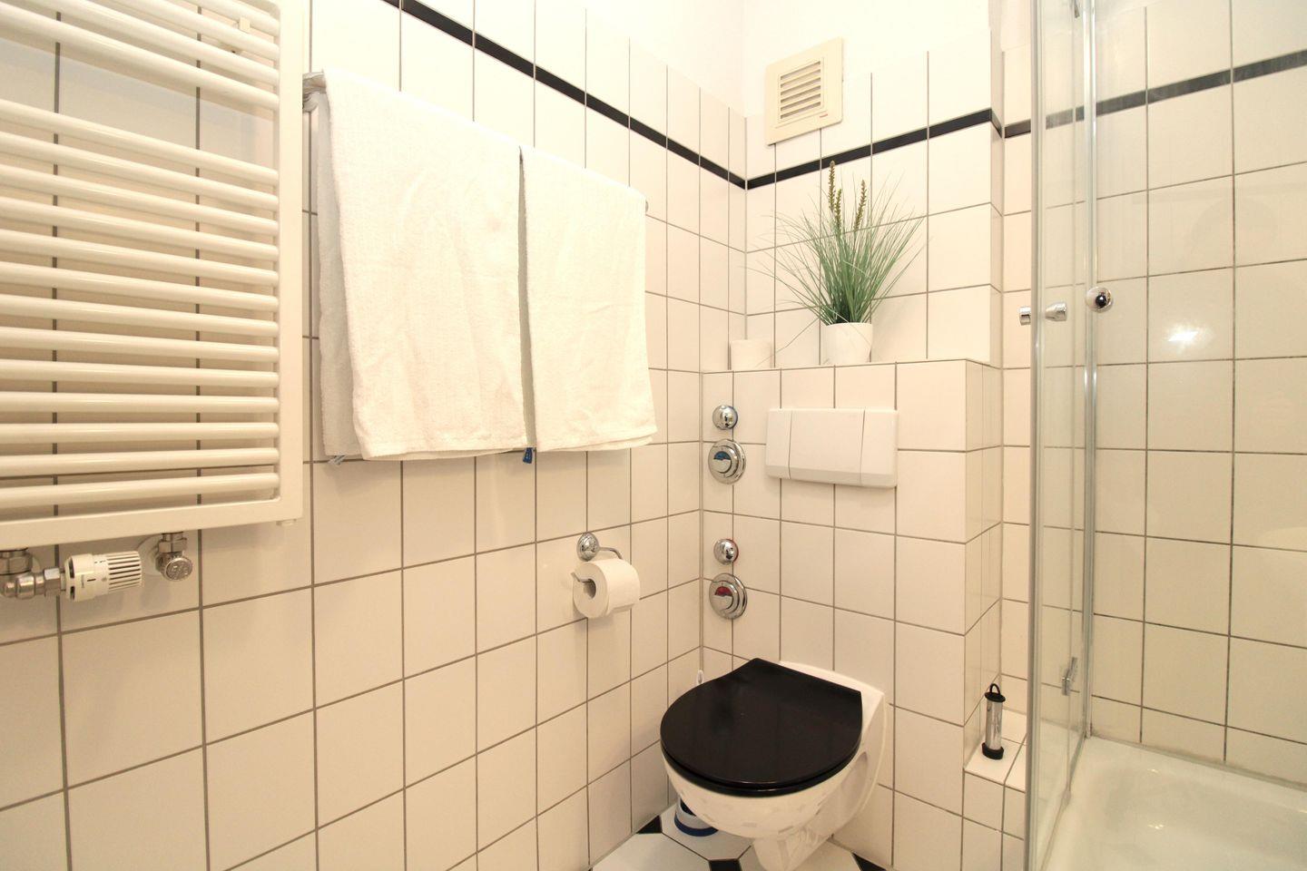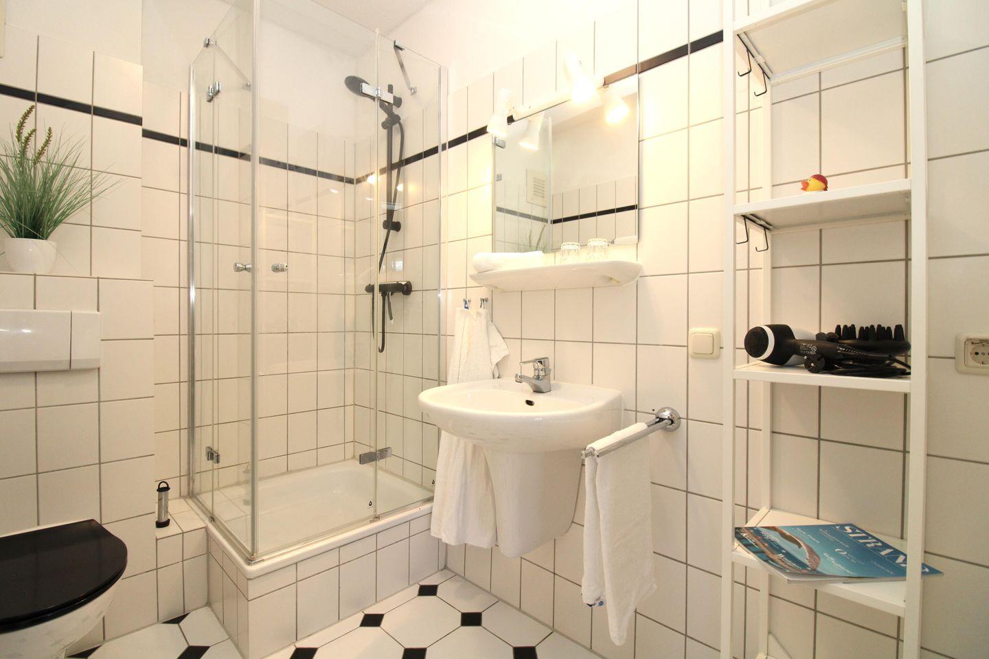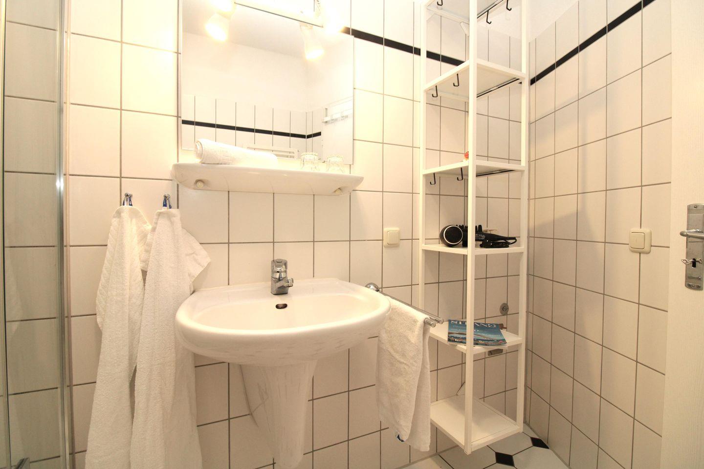Das Badezimmer verfügt über eine Dusche, Waschbecken, WC, einen Föhn sowie ausreichend Ablagemöglichkeiten.