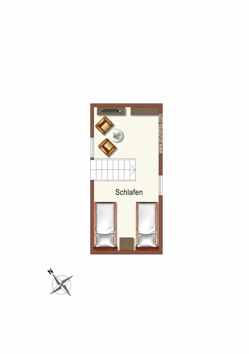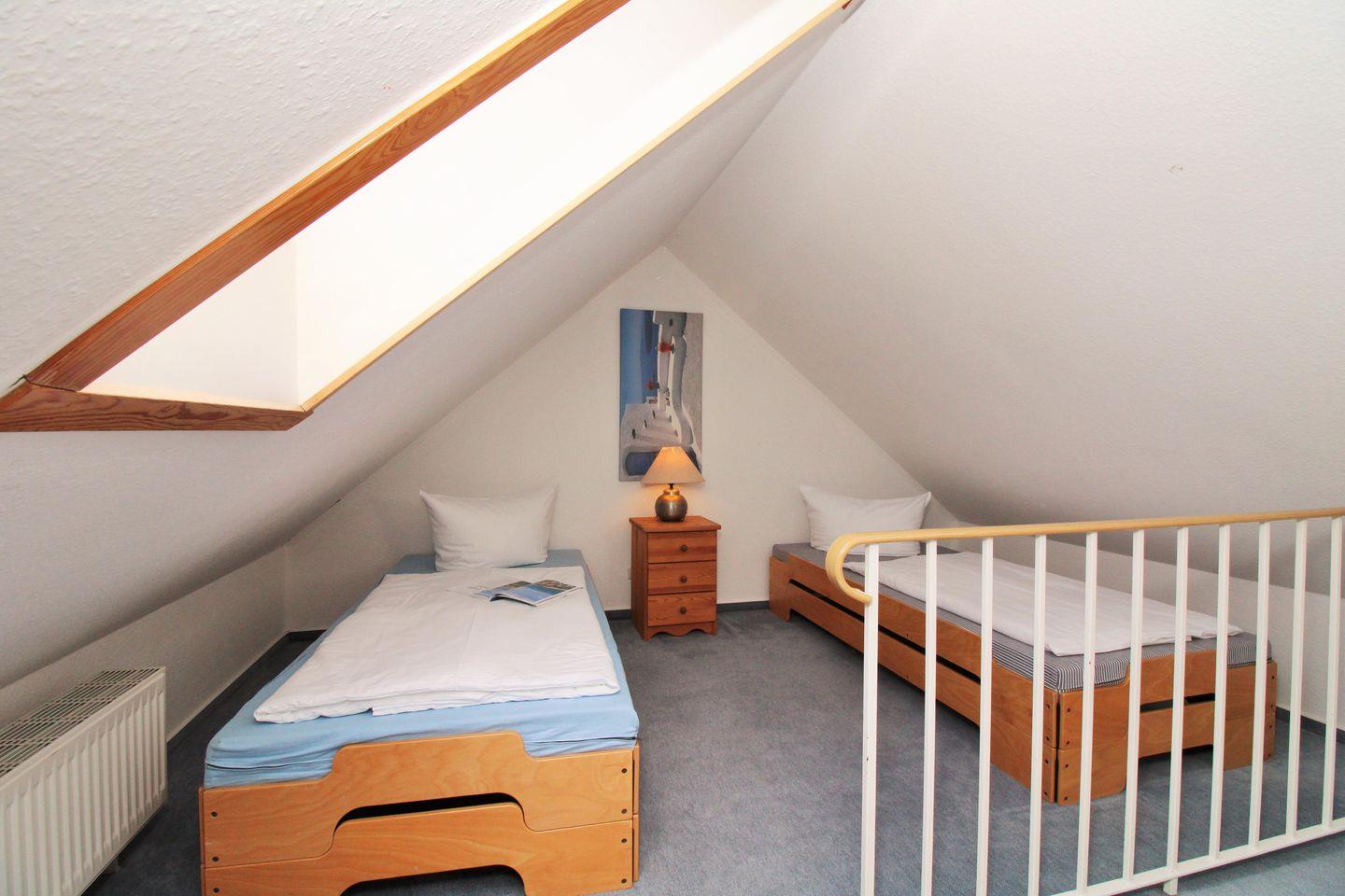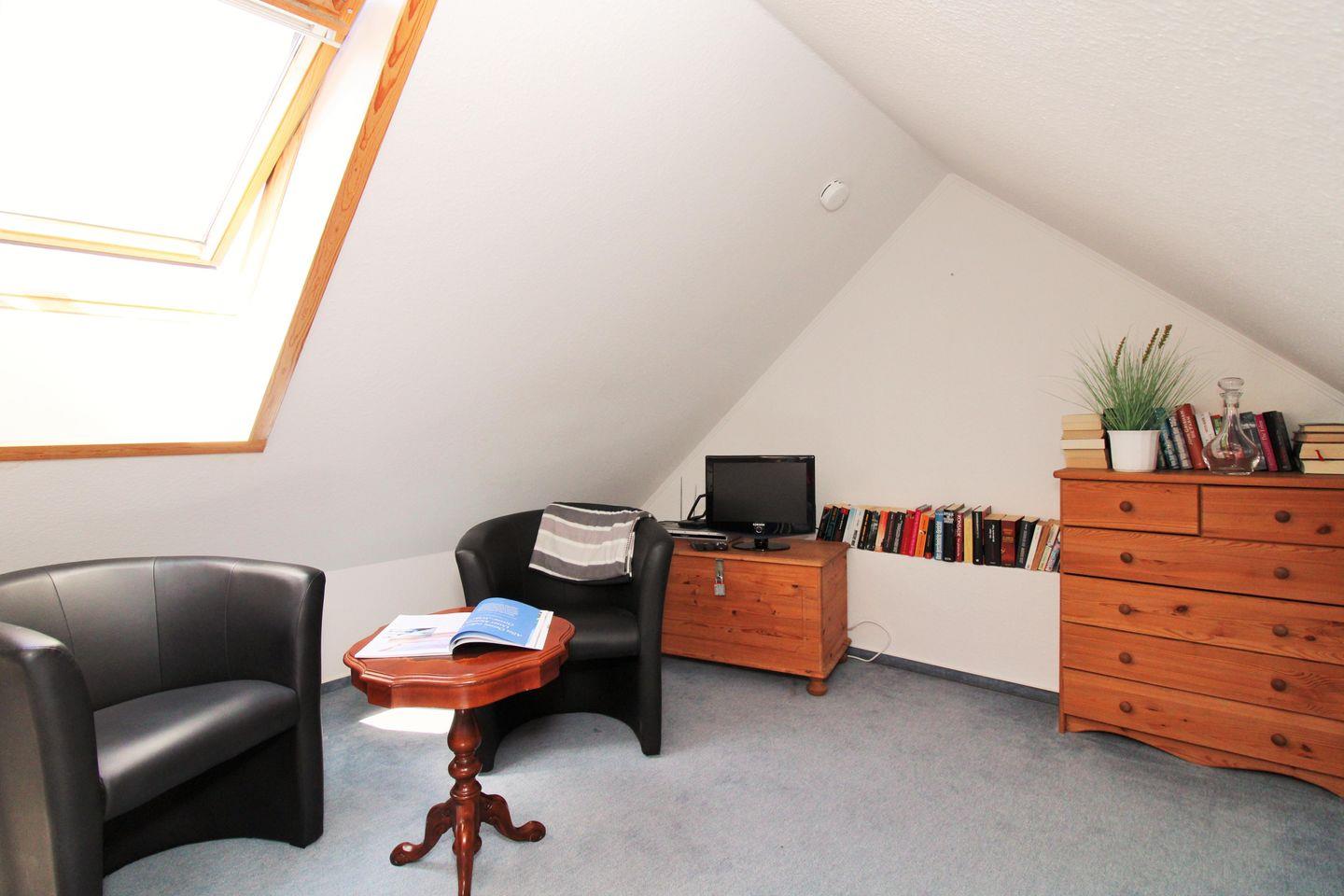 Über eine kleine Treppe aus dem Wohnzimmer erreichen Sie das Dachgeschoss der Wohnung mit dem 3. Schlafzimmer. Dieses ist ebenfalls mit 2 getrennt stehenden Einzelbetten, 2 Sesseln mit kleinem Tisch sowie 2 kleinen Kommoden eingerichtet und verfügt über ein zusätzliches kleines TV-Gerät. Wichtiger Hinweis: auf Grund der sehr steilen Treppe ist dieser Raum nicht (!) für kleine Kinder geeignet!