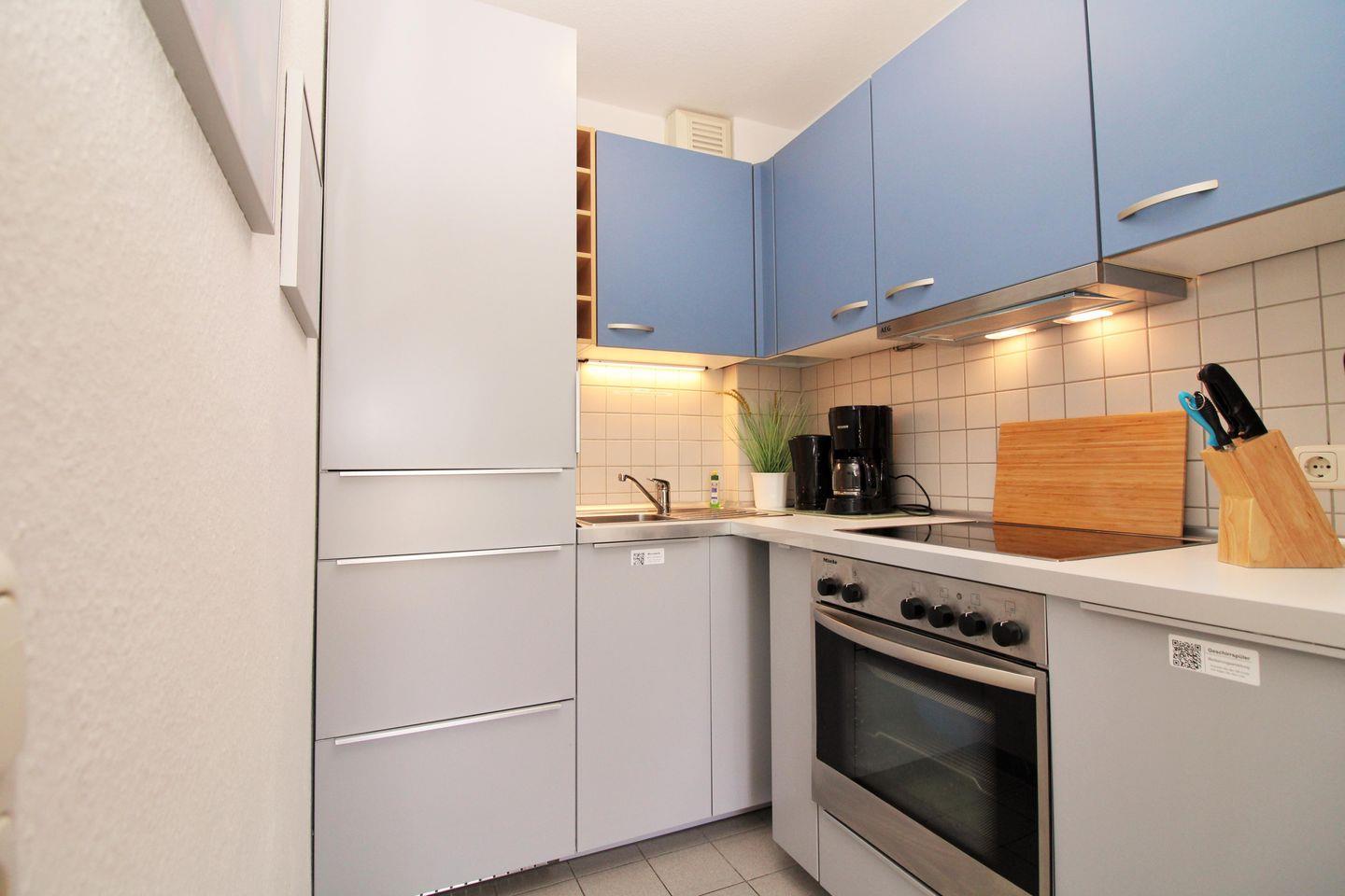 Die separate offene Küche beinhaltet eine voll ausgestattete Einbauküchenzeile mit 4-Platten-Ceran-Kochfeld, Backofen, Dunstabzug, Mikrowelle, Kühlschrank mit Gefrierfach, Geschirrspülmaschine, Kaffeemaschine, Wasserkocher und Toaster. Die Küche ist mit Geschirr, Gläsern, Besteck und Töpfen bestens und vollständig ausgestattet.