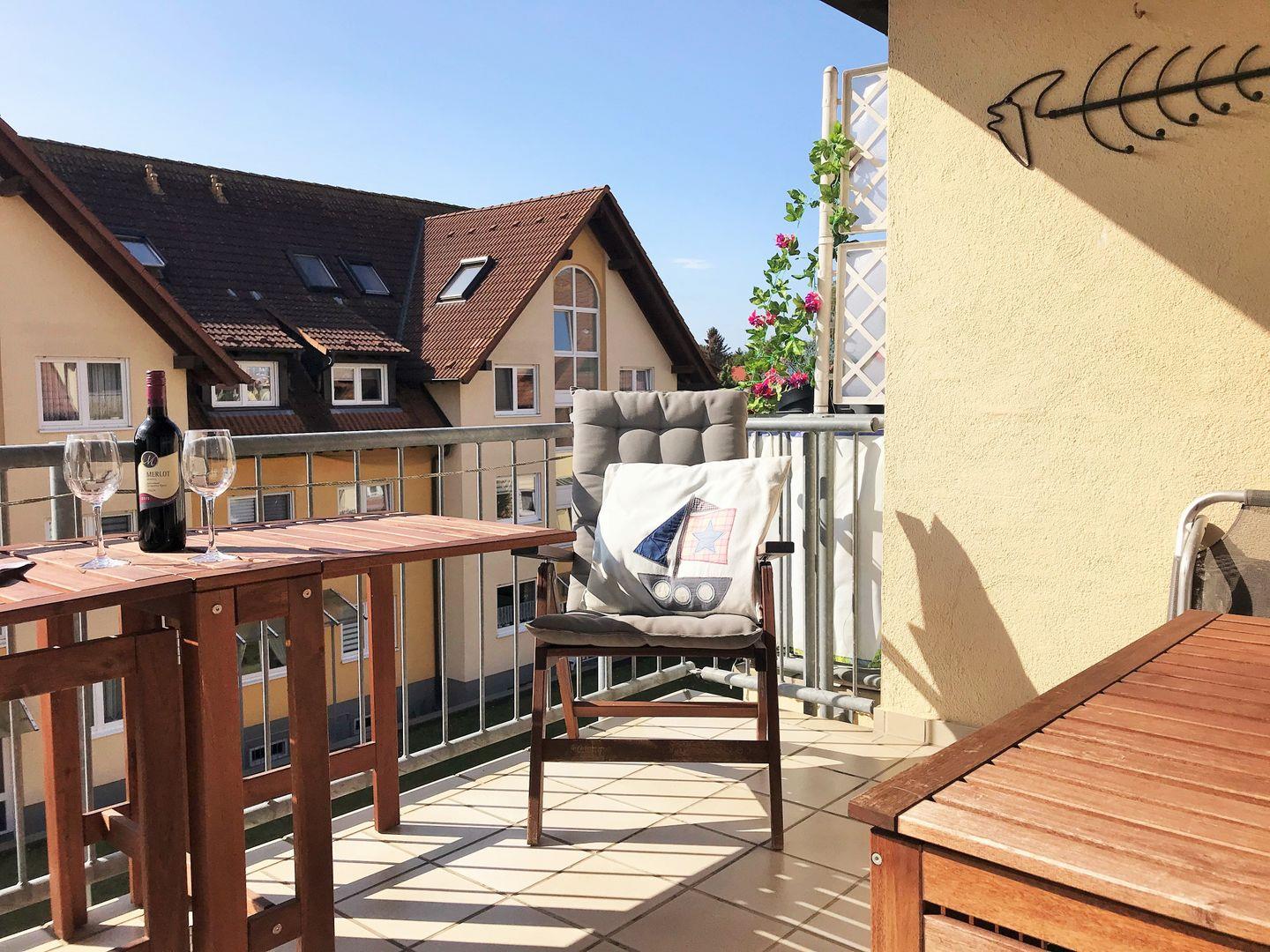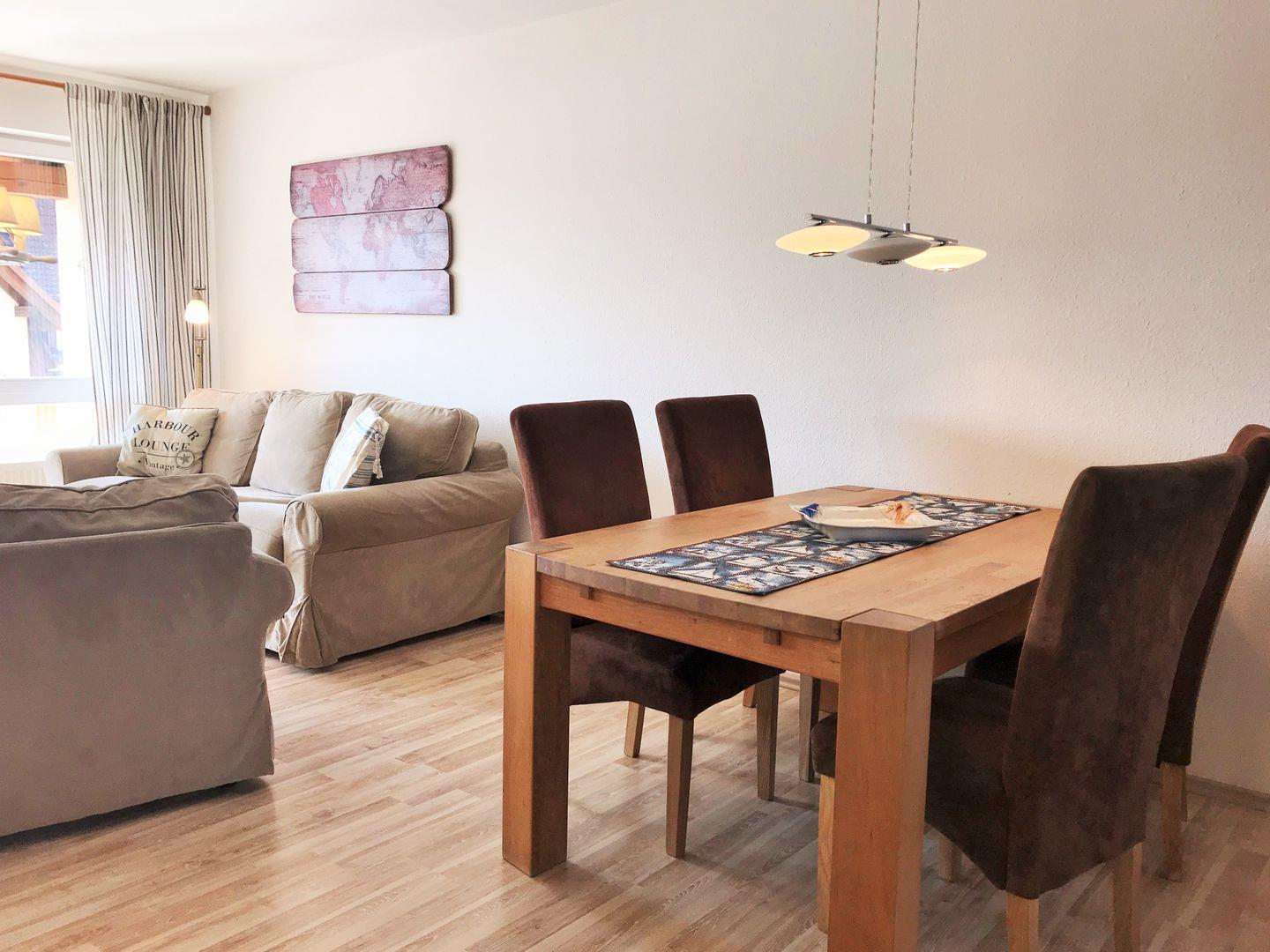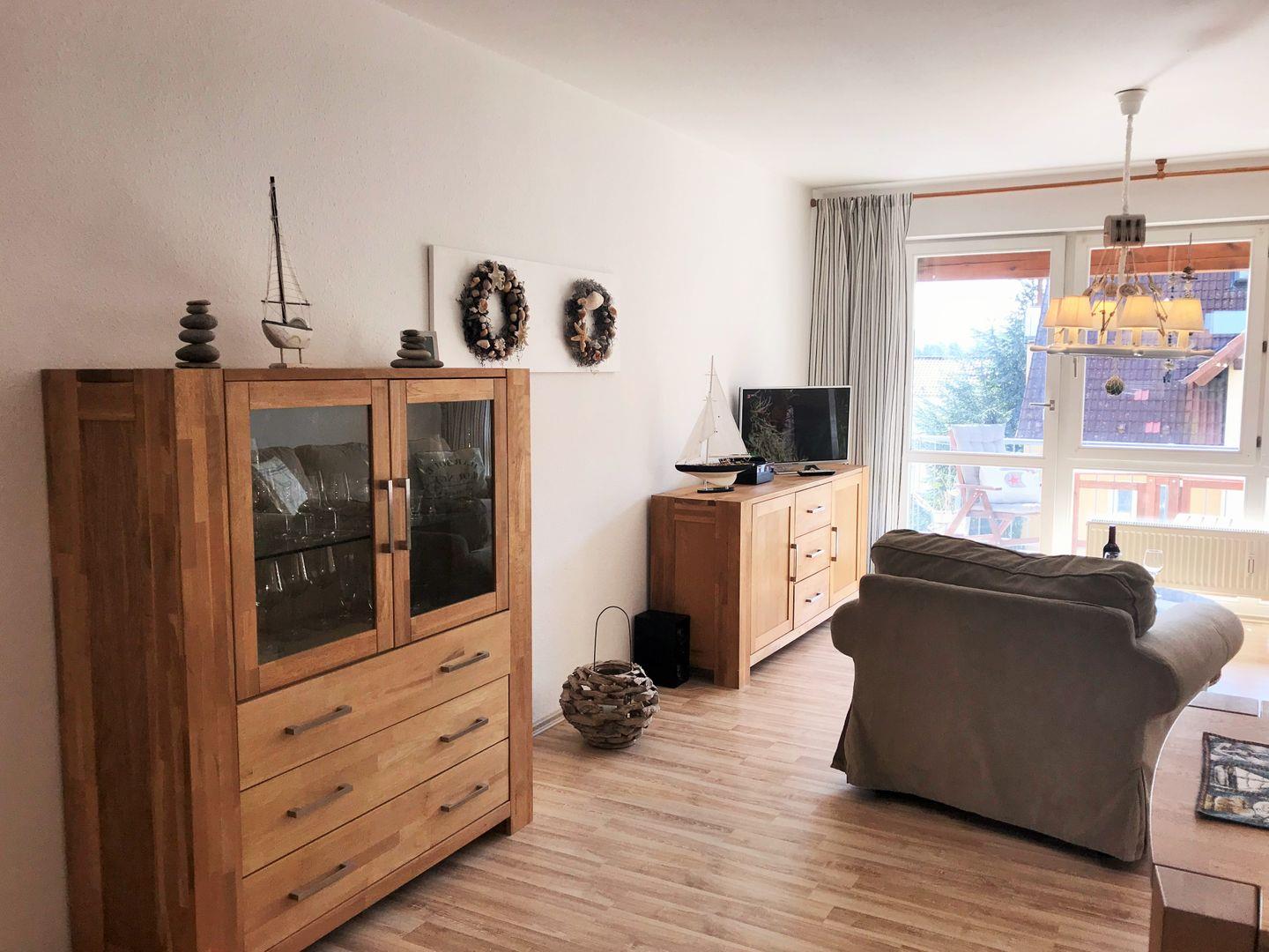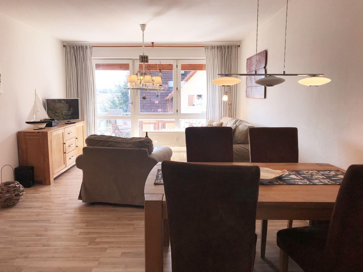 Das helle und großzügige Wohn-/Esszimmer verfügt über eine separate Sitzgruppe mit bequemer (ausziehbarer Schlaf-) Couch, Sessel und Couchtisch, einen separaten Esstisch mit 4 Stühlen, einen großen Schrank sowie ein Sideboard. Vom Wohnzimmer aus haben Sie direkten Zugang zu dem ca. 6 m² großen und sonnigen Balkon (nach Süden ausgerichtet) mit Balkonmöbeln. Hier sitzen Sie entspannt und gemütlich und können abends bei einem guten Glas Wein in Ruhe die lauen Sommernächte genießen!