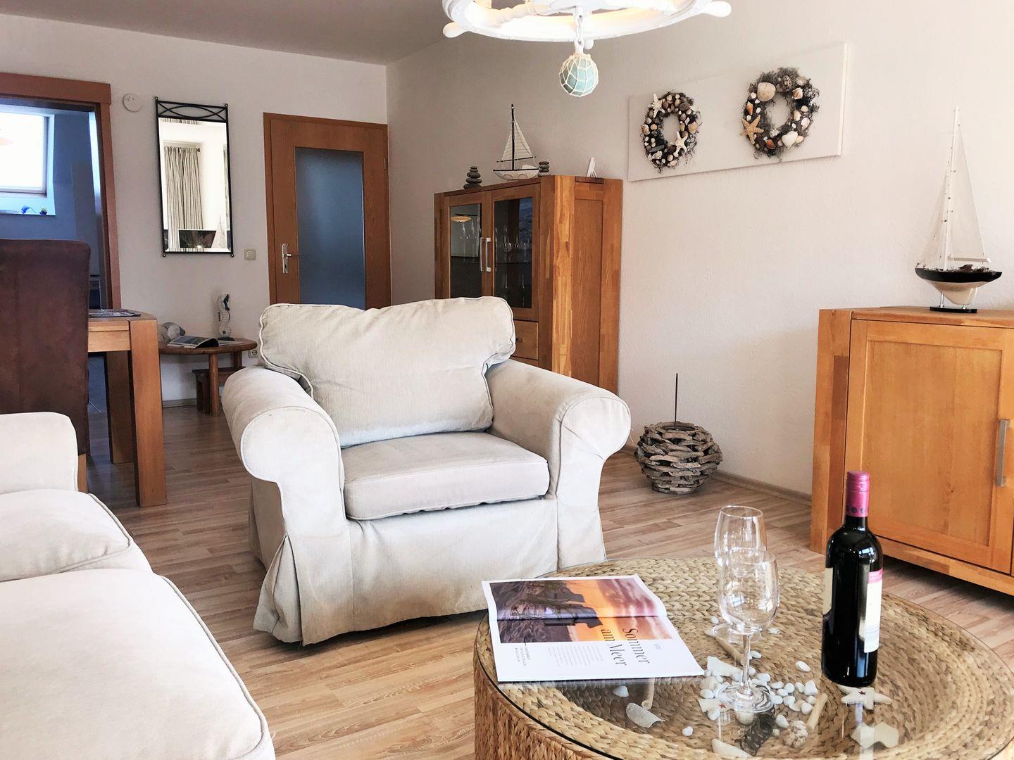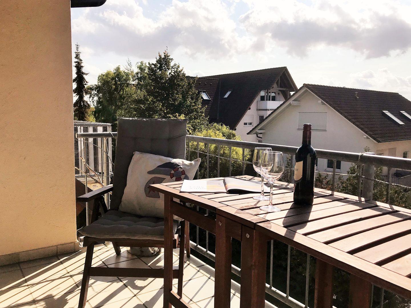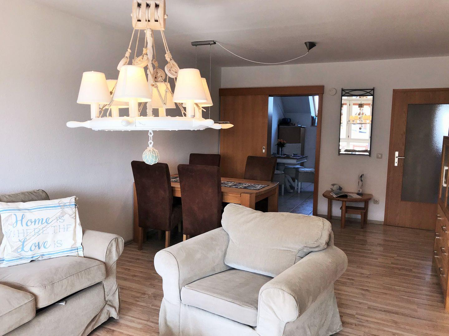 Das helle und großzügige Wohn-/Esszimmer verfügt über eine separate Sitzgruppe mit bequemer (ausziehbarer Schlaf-) Couch, Sessel und Couchtisch, einen separaten Esstisch mit 4 Stühlen, einen großen Schrank sowie ein Sideboard. Vom Wohnzimmer aus haben Sie direkten Zugang zu dem ca. 6 m² großen und sonnigen Balkon (nach Süden ausgerichtet) mit Balkonmöbeln. Hier sitzen Sie entspannt und gemütlich und können abends bei einem guten Glas Wein in Ruhe die lauen Sommernächte genießen!