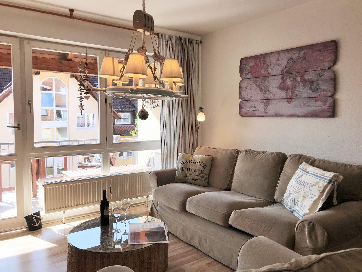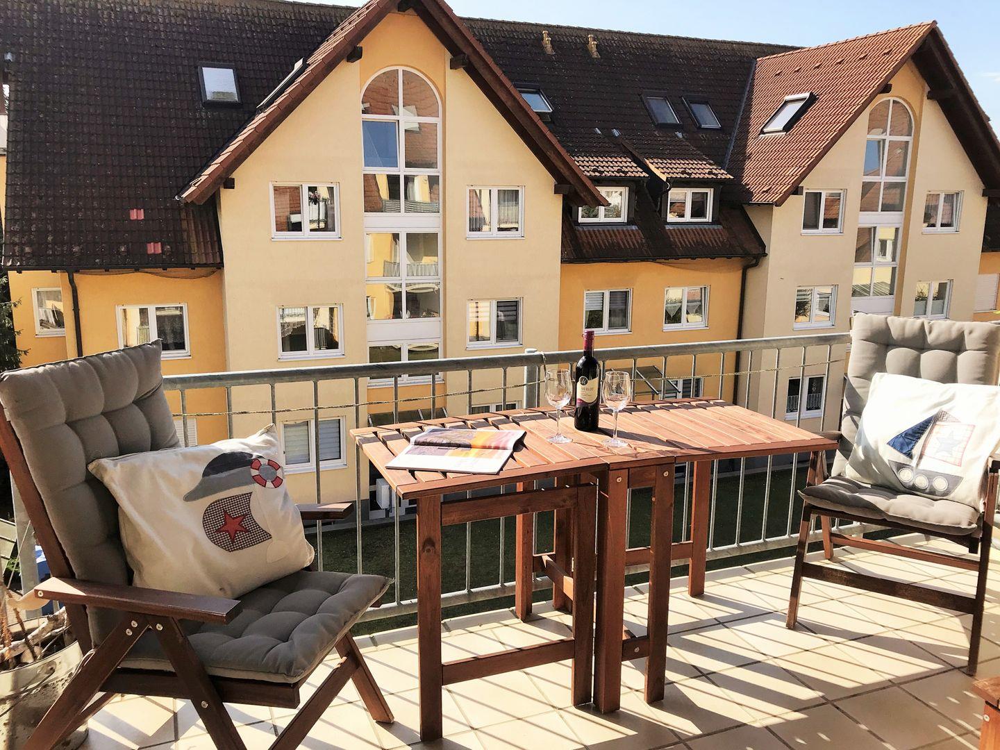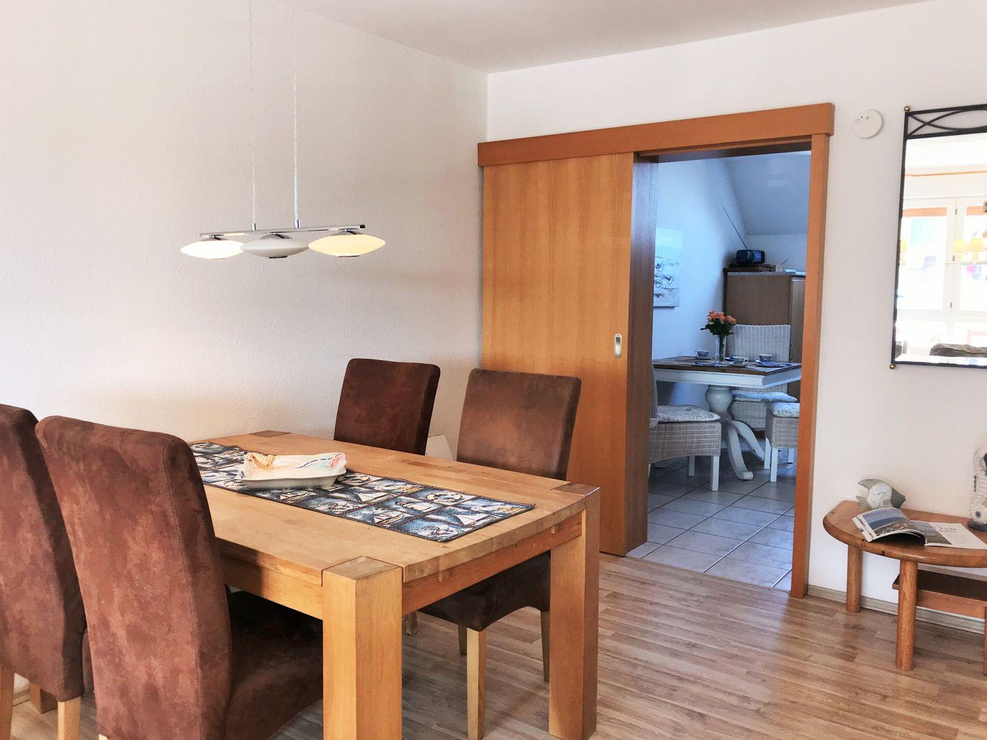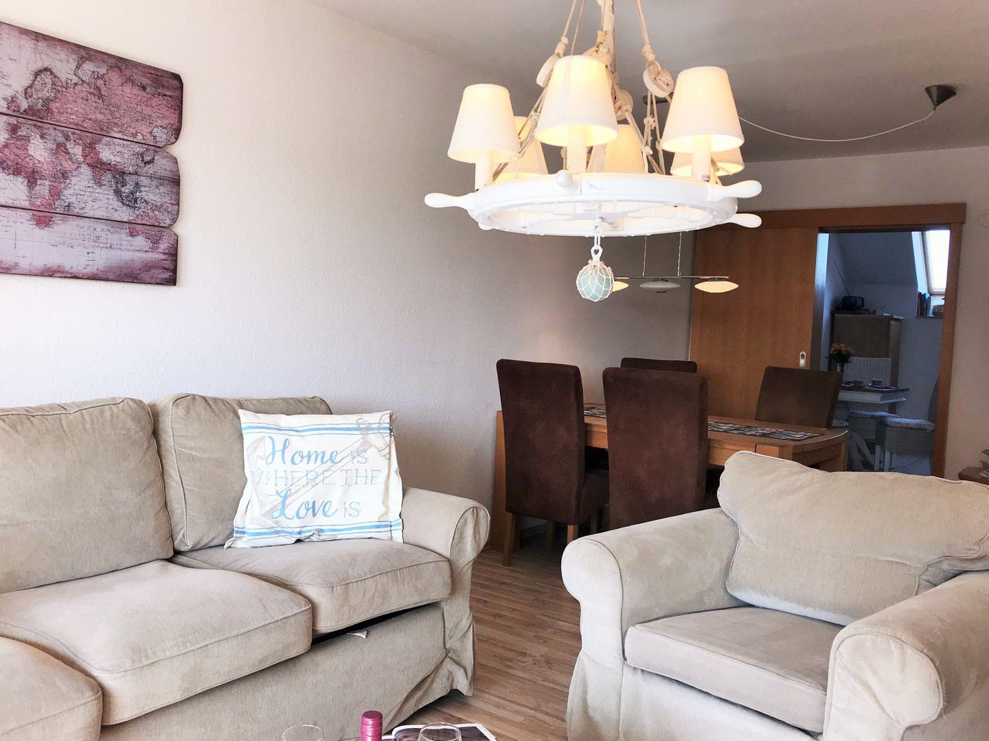 Das helle und großzügige Wohn-/Esszimmer verfügt über eine separate Sitzgruppe mit bequemer (ausziehbarer Schlaf-) Couch, Sessel und Couchtisch, einen separaten Esstisch mit 4 Stühlen, einen großen Schrank sowie ein Sideboard. Vom Wohnzimmer aus haben Sie direkten Zugang zu dem ca. 6 m² großen und sonnigen Balkon (nach Süden ausgerichtet) mit Balkonmöbeln. Hier sitzen Sie entspannt und gemütlich und können abends bei einem guten Glas Wein in Ruhe die lauen Sommernächte genießen!