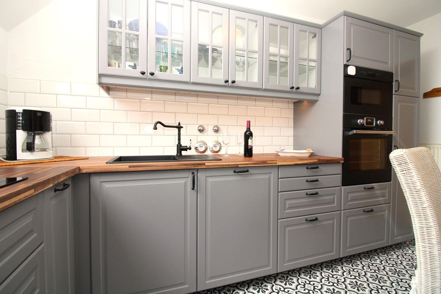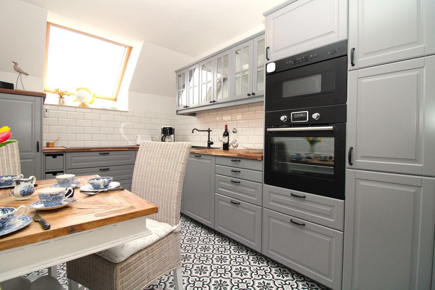 Die separate Küche beinhaltet eine voll ausgestattete Einbauküchenzeile mit 4-Zonen-Ceran-Kochfeld, Backofen, Mikrowelle, Kühlschrank mit Gefrierfach, Geschirrspülmaschine, Kaffeemaschine, Wasserkocher und Toaster. Darüber hinaus gibt es in der Küche eine separate zusätzliche Essecke mit Tisch und 3 Stühlen. Die Küche ist mit Geschirr, Gläsern, Besteck und Töpfen bestens und vollständig ausgestattet.