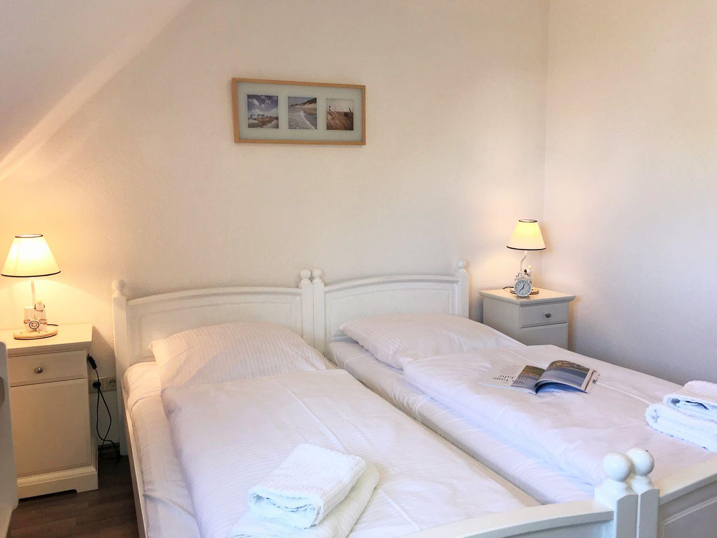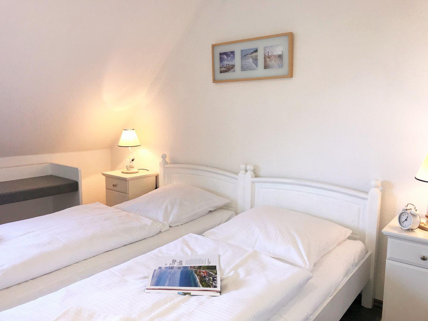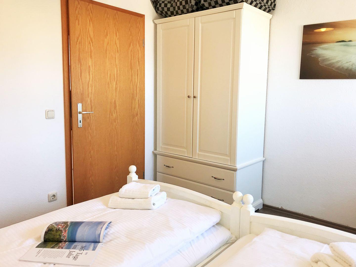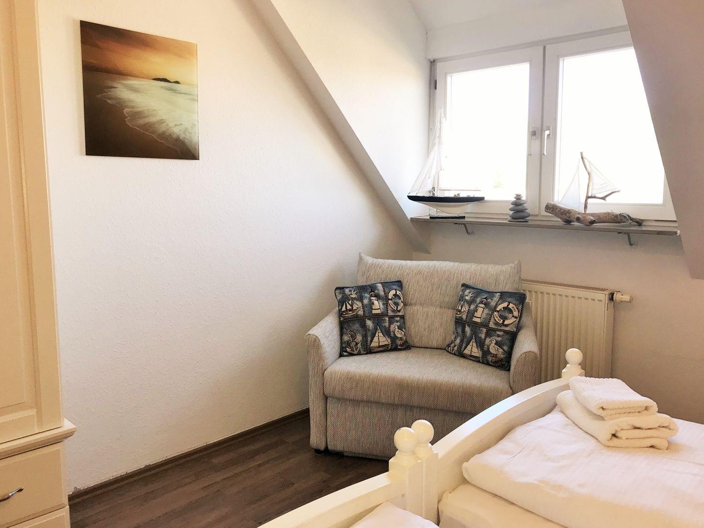 Das freundliche und gemütliche Schlafzimmer (mit weitläufigem Blick auf die nahe Ostsee) ist mit einem bequemen Doppelbett, Nachttischen, einem geräumigen Kleiderschrank sowie einem (aufklappbaren Schlaf-) Sessel eingerichtet. Falls erforderlich, kann dieser Sessel für eine weitere 3. Person zum Einzelbett aufgeklappt bzw. umgebaut werden.