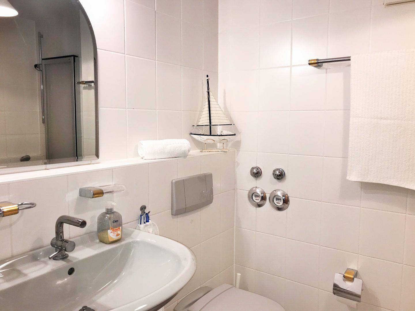 Das freundliche Badezimmer verfügt über eine Badewanne mit aufklappbarer Dusch-Trennwand, Waschbecken, WC sowie ausreichend Ablagemöglichkeiten.