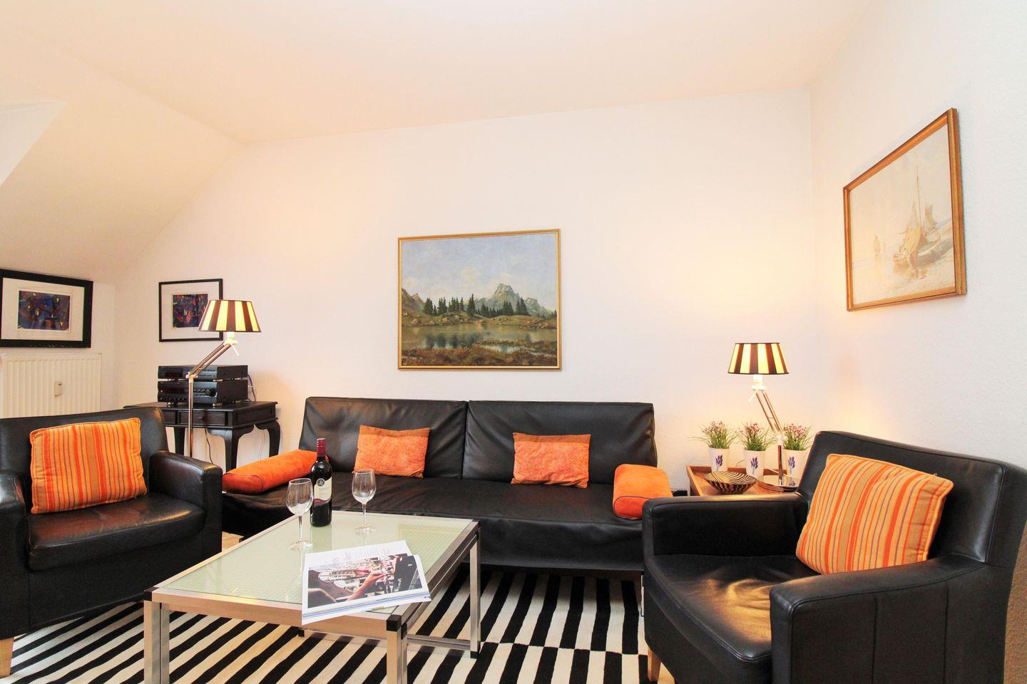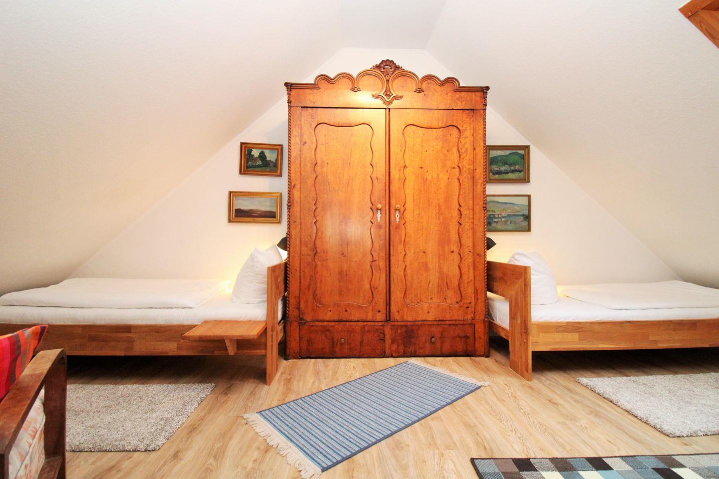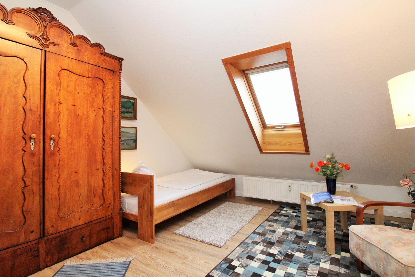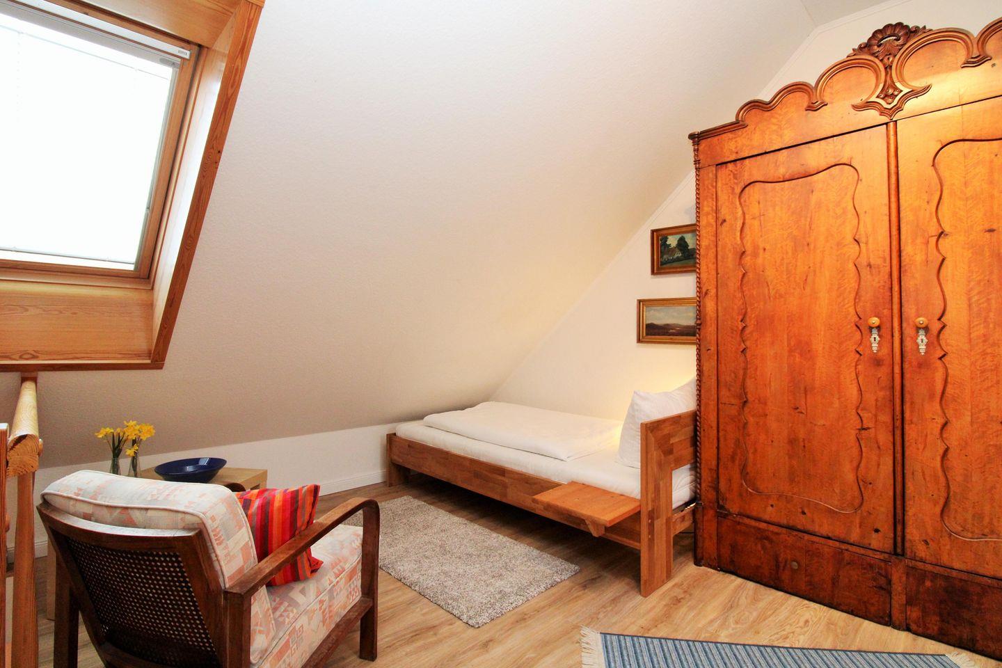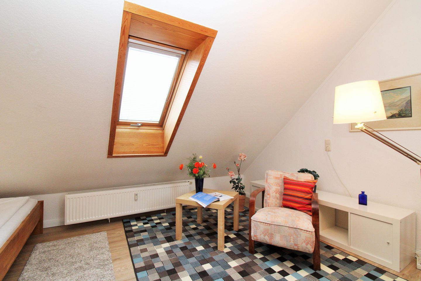 Das sehr geräumige und separate 2. Schlafzimmer (im 2. OG) verfügt über 2 getrennte Einzelbetten, einen geräumigen Kleiderschrank, ein kleines Sideboard sowie 2 Sitz- bzw. Leseecken mit jeweils 1 bequemen Sessel und einem kleinen Tisch.