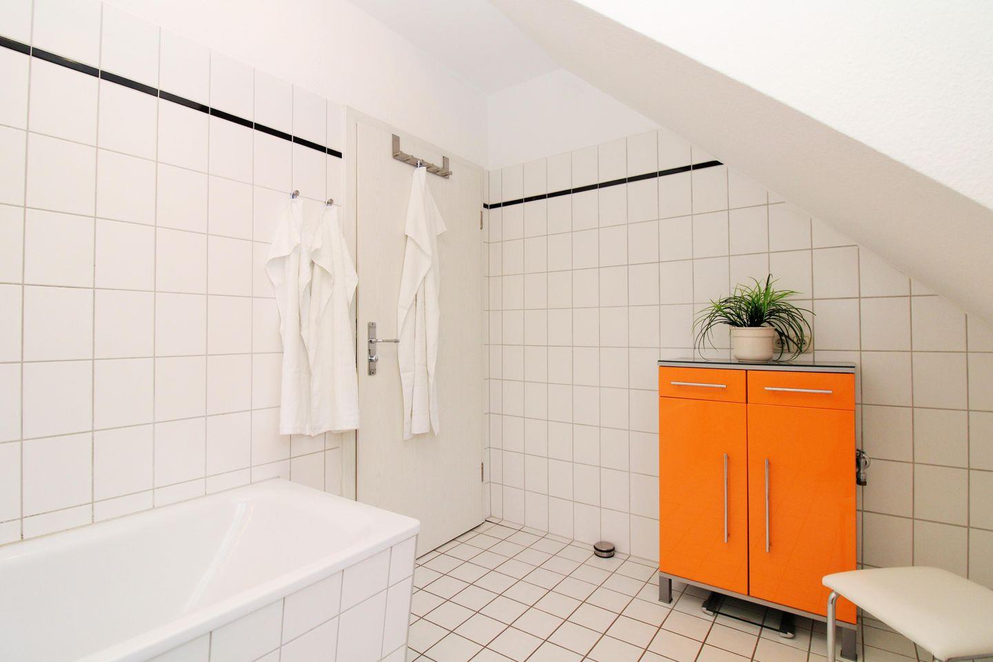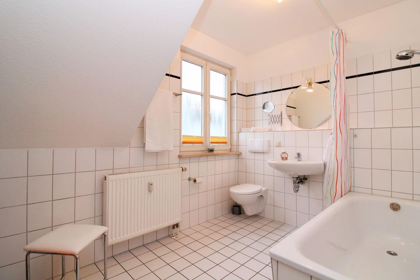 Das helle und geräumige Badezimmer (mit Tageslicht / Fenster) verfügt über eine Badewanne, Waschbecken mit Kosmetikspiegel, WC, einen Badezimmerschrank, einen Hocker sowie ausreichend Ablagemöglichkeiten.